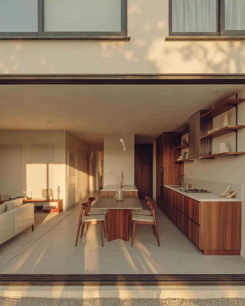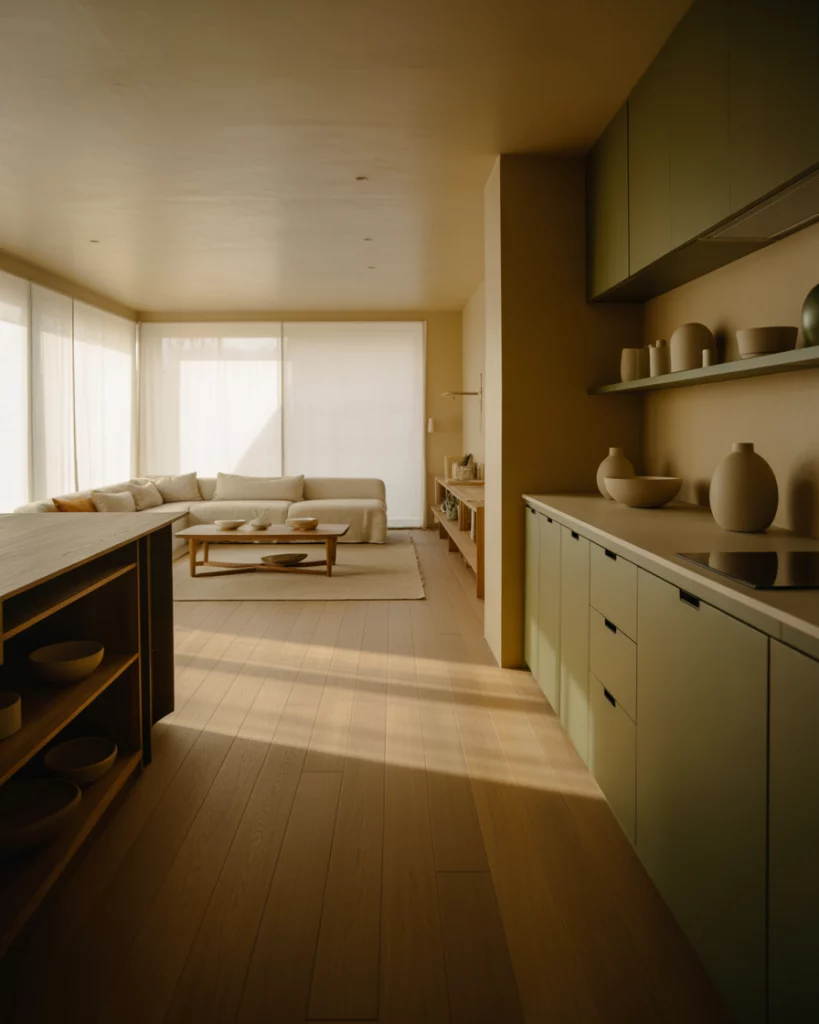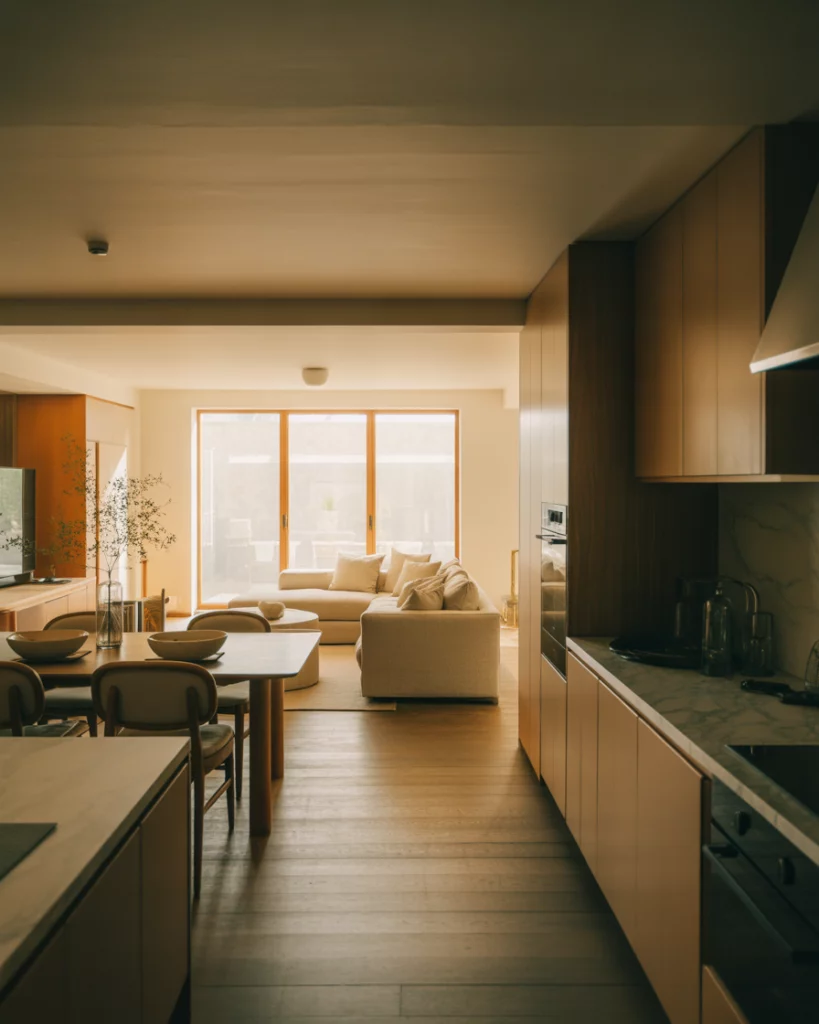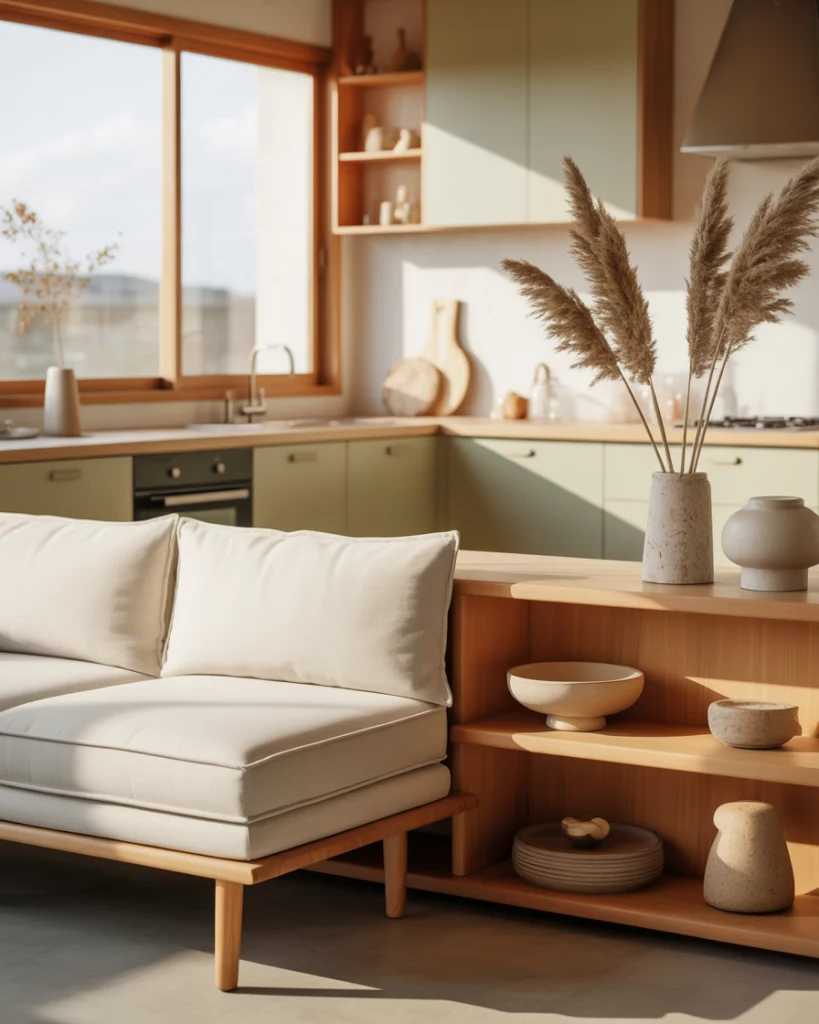 The Japandi style continues to influence open kitchen living rooms by blending softness and function. Low seating, natural materials, and thoughtful interior design choices create a grounded atmosphere that connects kitchen, living, and dining seamlessly. A common mistake is going too sparse. Without enough texture—wood grain, linen, or clay—the space can feel cold instead of calm.