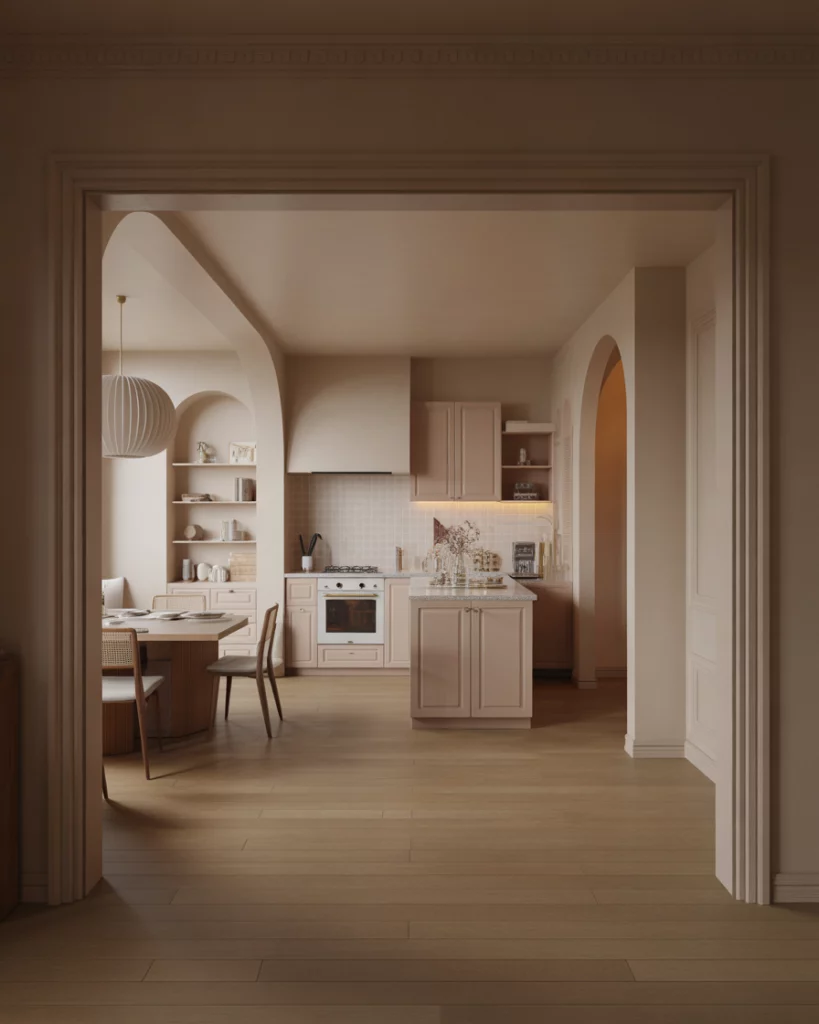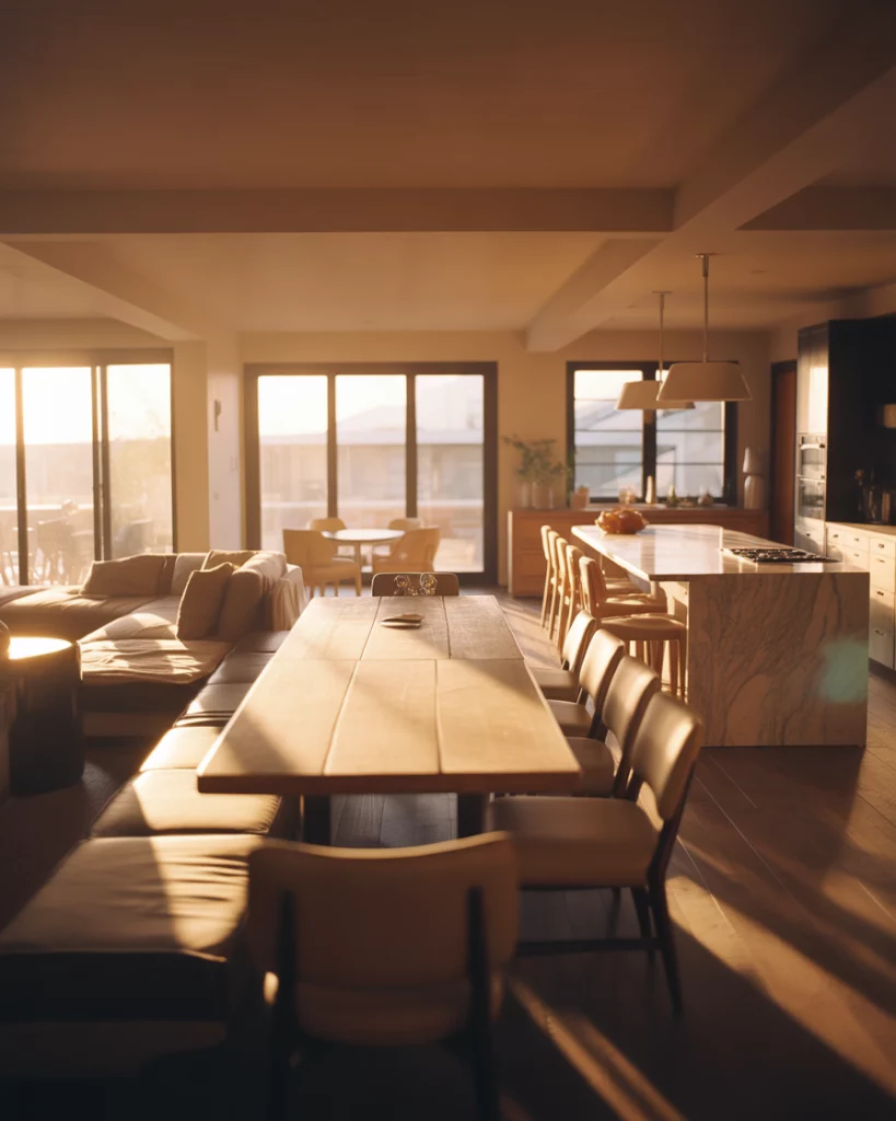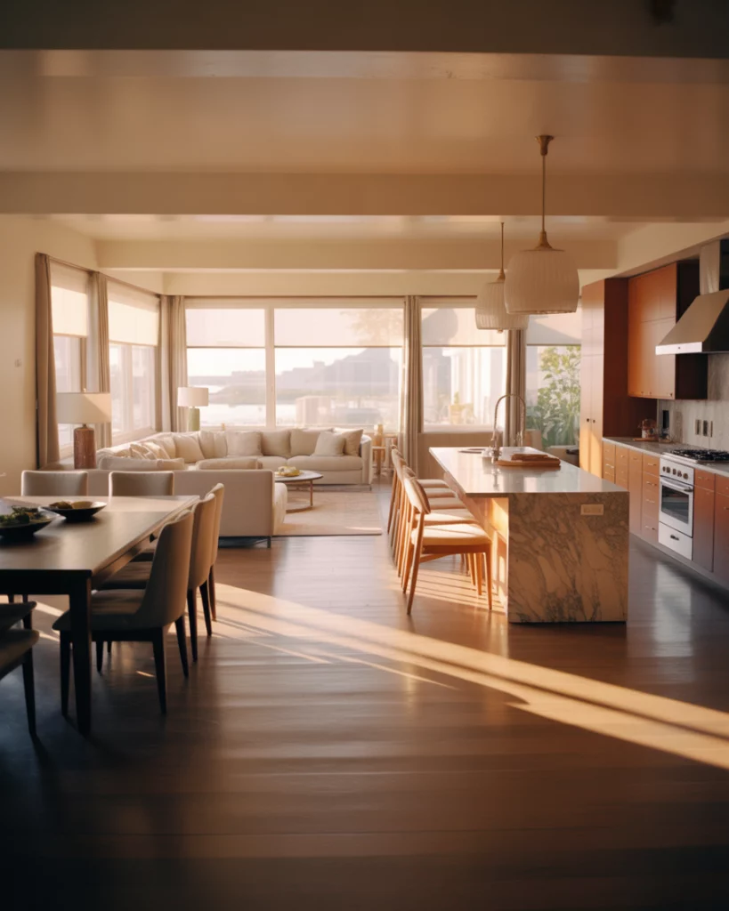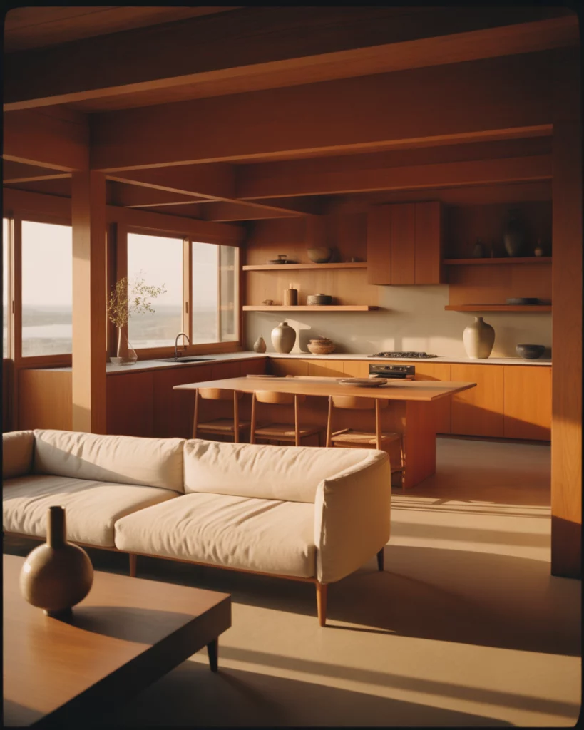 The Japandi style continues to influence open kitchen living rooms by blending softness and function. Low seating, natural materials, and thoughtful interior design choices create a grounded atmosphere that connects kitchen, living, and dining seamlessly. A common mistake is going too sparse. Without enough texture—wood grain, linen, or clay—the space can feel cold instead of calm.