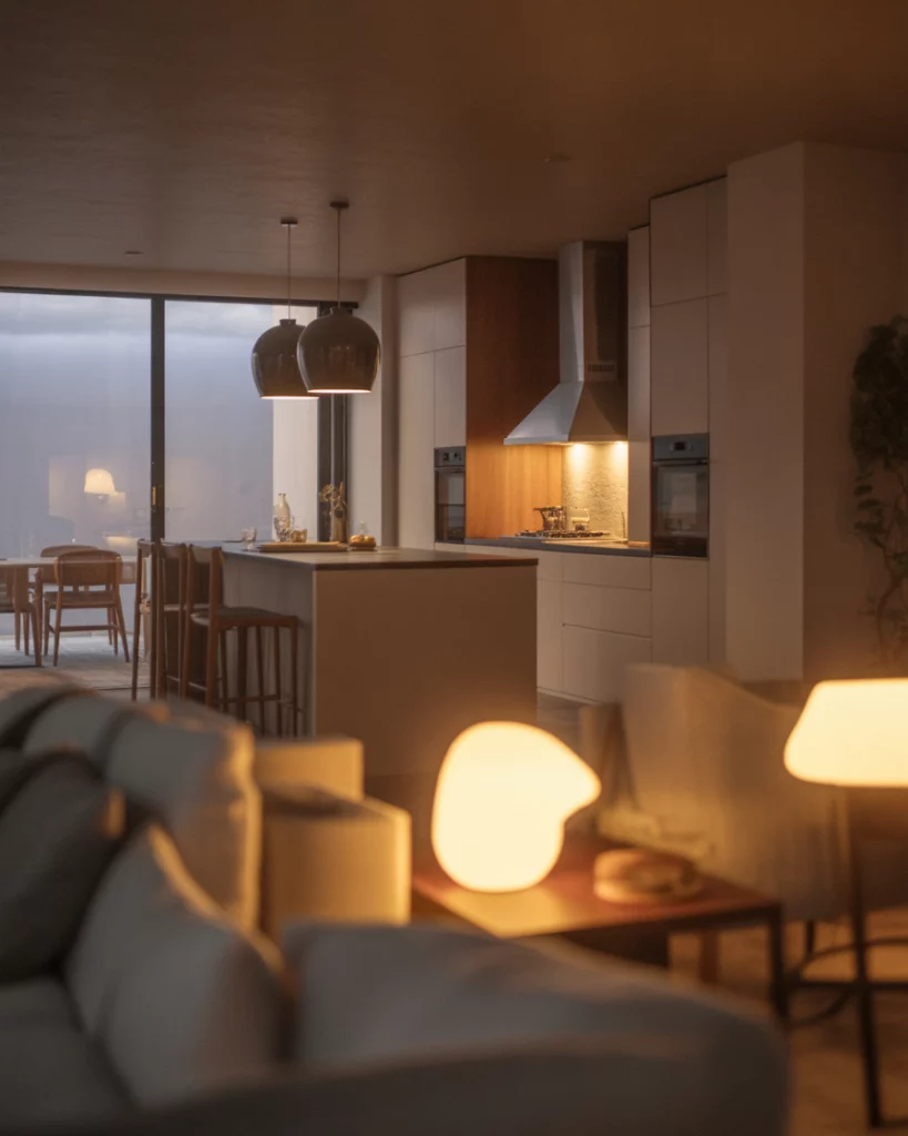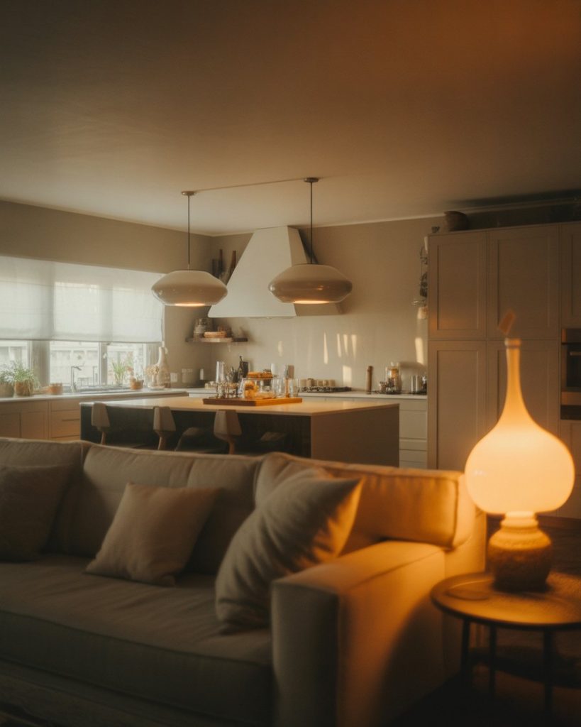 In an open kitchen living room, lighting defines the layout as much as furniture does. Thoughtful design now relies on layers—pendants over the island, lamps near the couch, and soft ambient light that ties zones together. This approach keeps the space visually organized without physical dividers. Designers often note that one central ceiling light is a mistake. Multiple light sources at different heights create intimacy and allow each zone to function independently, especially in the evenings.