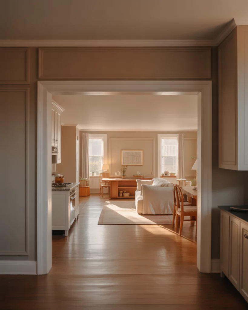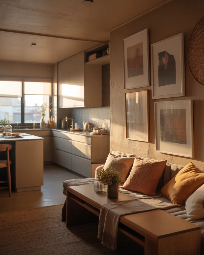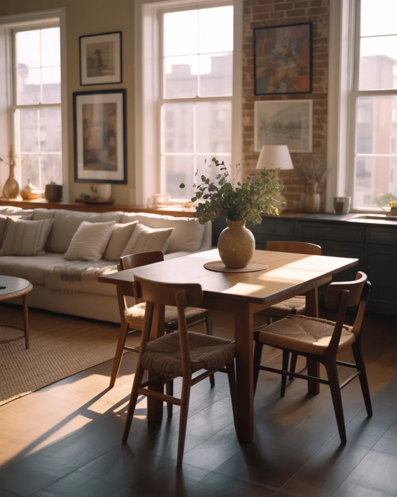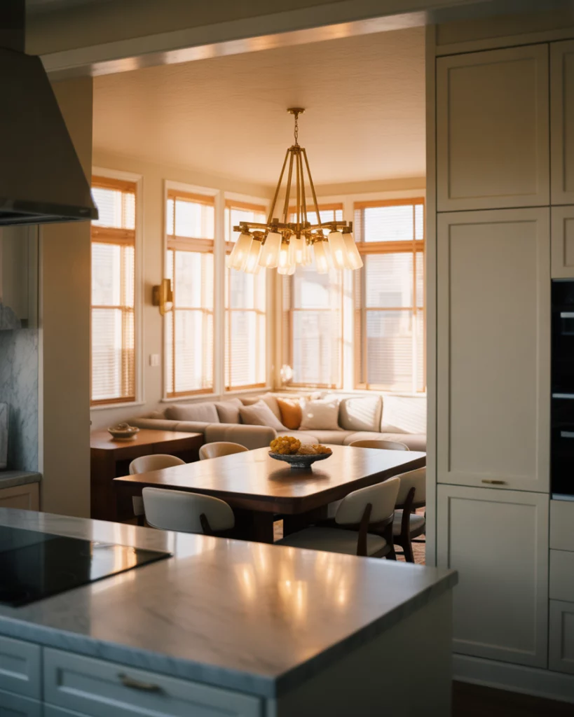 In an apartment, layering dining room decor helps the open kitchen living room feel intentional. Soft lighting, artwork, and textiles create visual pauses that break up the openness without adding walls or furniture bulk. A practical insight is to repeat materials across zones—wood tones, metals, or fabrics—so the apartment reads as one cohesive space rather than separate rooms pushed together.