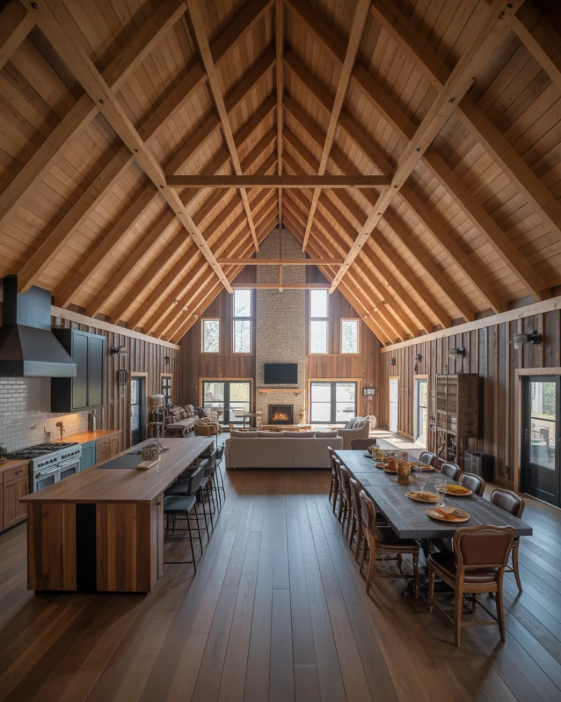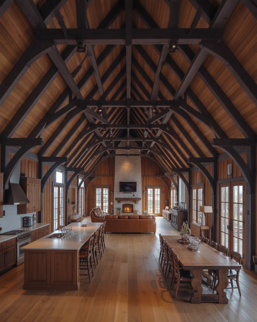 In expansive homes like a barndominium, the open kitchen living room becomes a true concept space. Large spans allow a generous dining room floor plan that blends seamlessly with seating and cooking zones. The challenge isn’t space—it’s making it feel intimate rather than cavernous. This layout works best in rural or semi-rural settings where square footage is generous. Layered lighting and oversized furniture help visually anchor each zone so the openness feels intentional, not empty.