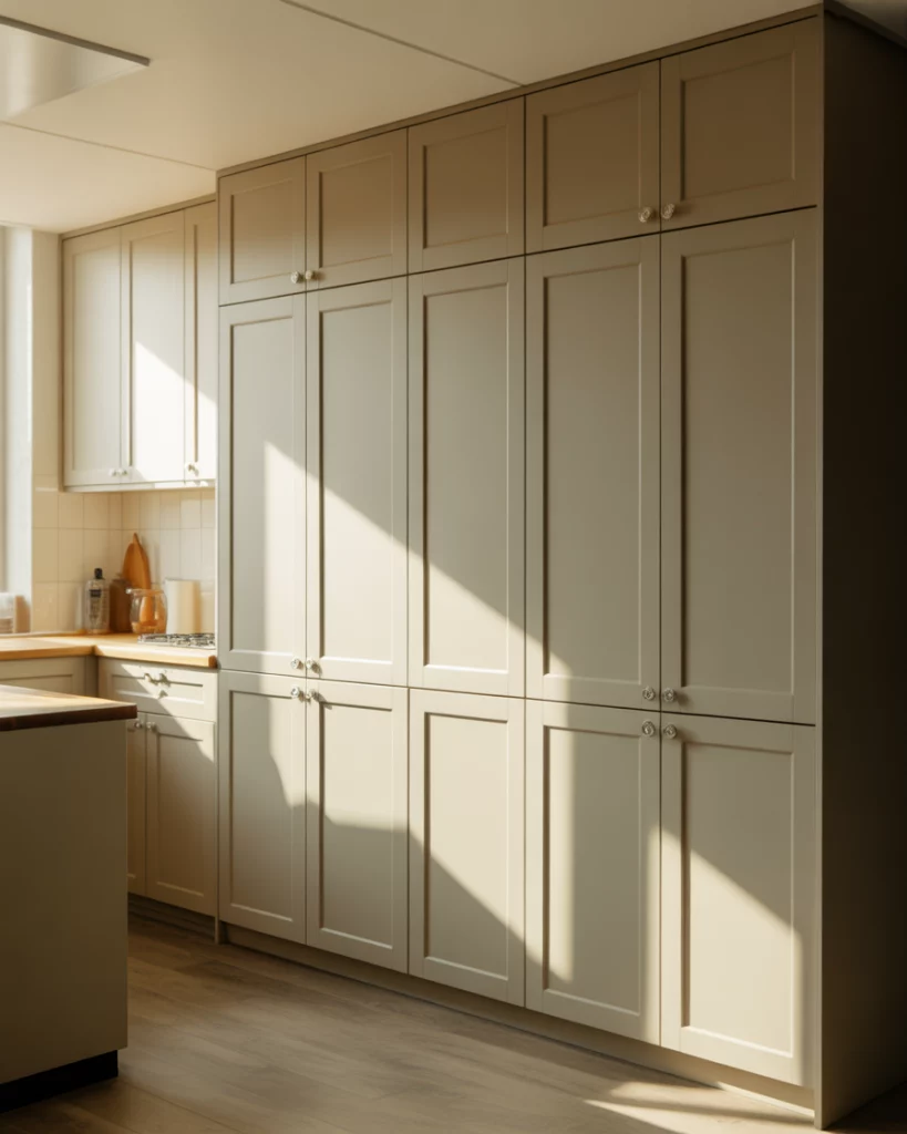 One of the strongest pantry cabinet 2026 trends is going vertical. A floor-to-ceiling kitchen pantry creates a seamless wall effect while maximizing food storage. This approach works beautifully in modern American homes where cabinetry doubles as architecture. Tall doors, minimal hardware, and consistent finishes make the pantry feel intentional rather than bulky. Where it works best is in homes with standard or high ceilings, especially newer builds or remodeled suburban kitchens. By running cabinetry to the ceiling, homeowners eliminate wasted space, reduce visual clutter, and gain storage for bulk items, seasonal appliances, and overflow staples without crowding the main kitchen zone.