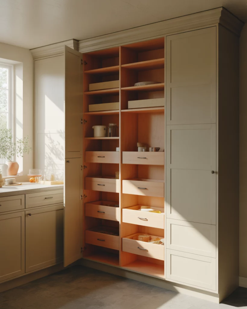 Deep pantry cabinets are being rethought for pantry cabinet 2026. Instead of endless dark shelves, designers now focus on how to organize deep spaces with drawers and tiered inserts. This keeps large volumes manageable without visual clutter. A common mistake is stacking items without structure. The fix is vertical separation: drawers within cabinets prevent forgotten items and make deep storage feel far more user-friendly.