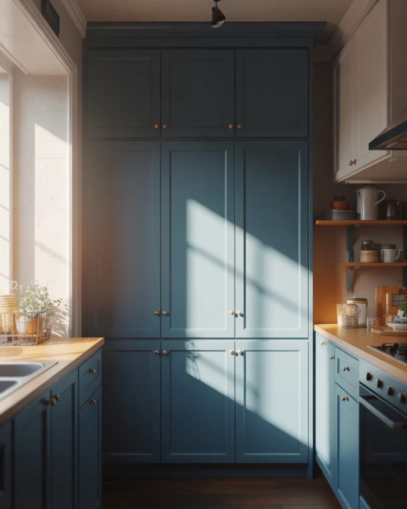 Blue pantry cabinets are emerging as a standout color choice in pantry cabinet 2026 design. From navy to muted slate, blue adds depth while remaining timeless, especially when paired with warm woods. An expert-style note is to balance blue with lighter surroundings. This prevents the pantry from feeling heavy and keeps the kitchen visually open.