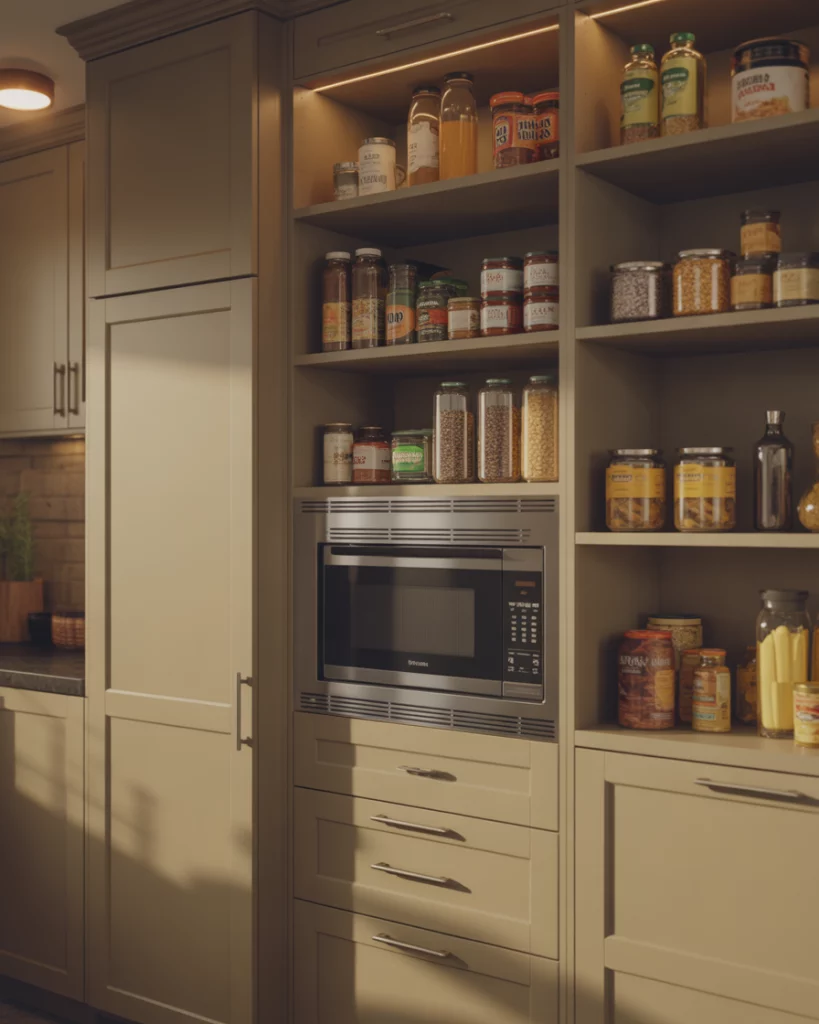 It is a growing trend in kitchen design to build the microwave into the pantry cabinetry to achieve a seamless appearance in the kitchen. In pantry cabinet 2026 layouts, it allows the kitchen appliances to remain off the countertops while still being easy to access. This is a great layout design for homes with kids, as it allows the microwave to be placed at a good height for the adults to easily supervise what the kids are using it for. This design layout increases the overall aesthetic and functionality of the kitchen.