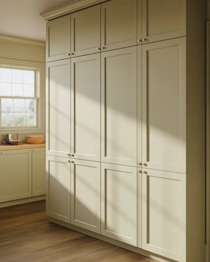 One of the strongest pantry cabinet 2026 trends is going vertical. A floor-to-ceiling kitchen pantry creates a seamless wall effect while maximizing food storage. This approach works beautifully in modern American homes where cabinetry doubles as architecture. Tall doors, minimal hardware, and consistent finishes make the pantry feel intentional rather than bulky. Where it works best is in homes with standard or high ceilings, especially newer builds or remodeled suburban kitchens. By running cabinetry to the ceiling, homeowners eliminate wasted space, reduce visual clutter, and gain storage for bulk items, seasonal appliances, and overflow staples without crowding the main kitchen zone.