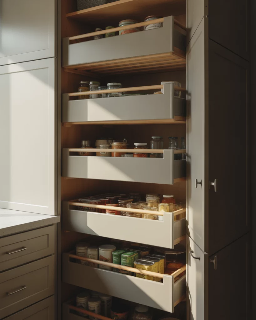 Deep pantry cabinets are being rethought for pantry cabinet 2026. Instead of endless dark shelves, designers now focus on how to organize deep spaces with drawers and tiered inserts. This keeps large volumes manageable without visual clutter. A common mistake is stacking items without structure. The fix is vertical separation: drawers within cabinets prevent forgotten items and make deep storage feel far more user-friendly.