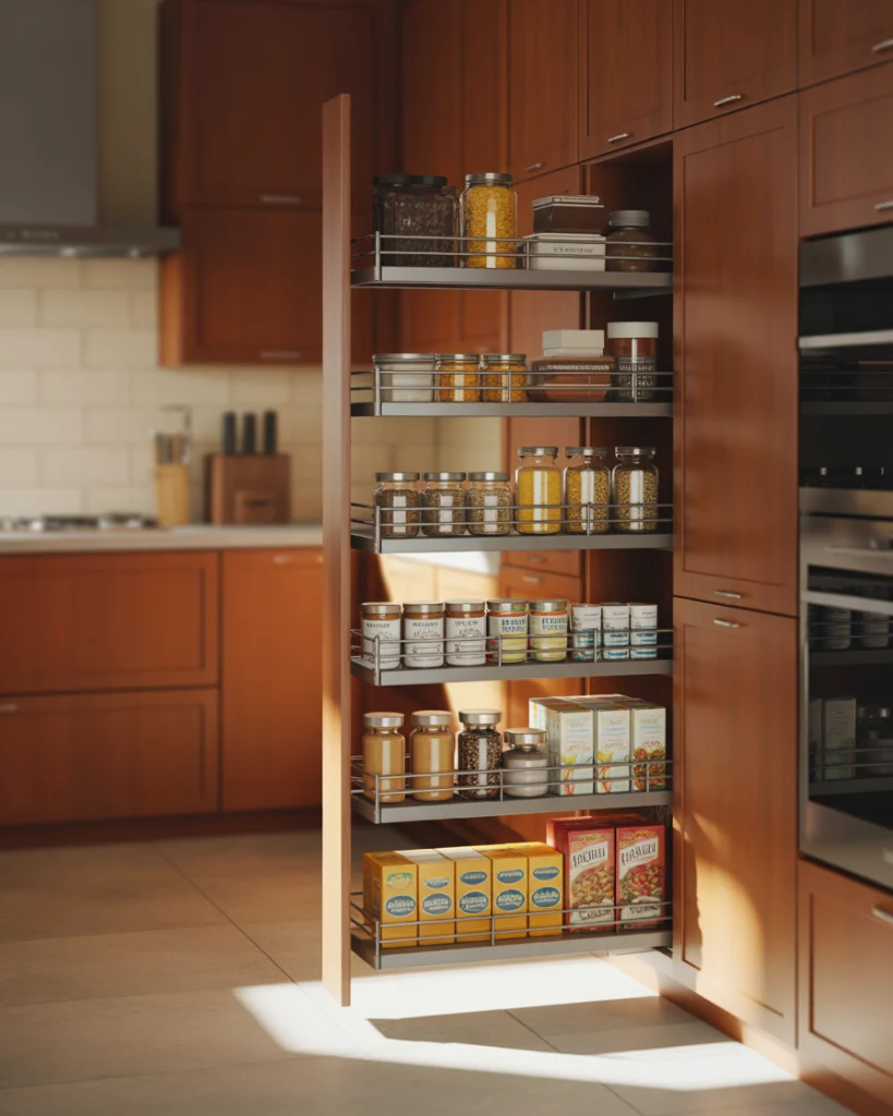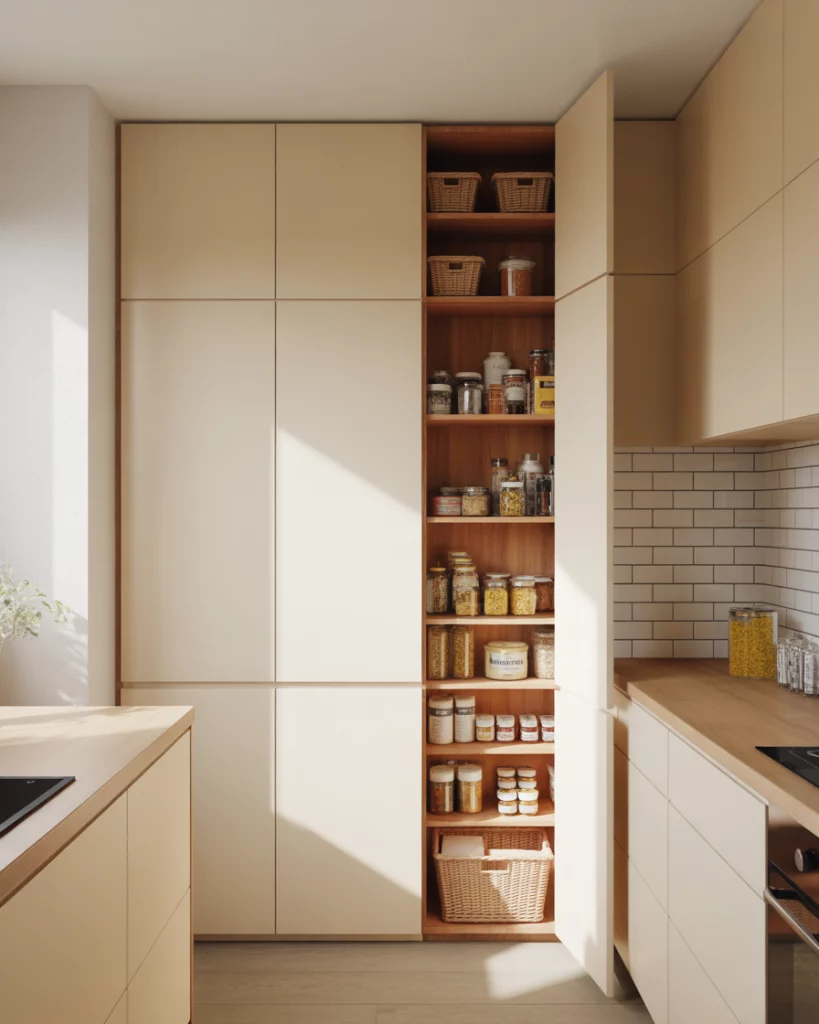 Pullout pantry cabinets are redefining organization in the tall kitchen layout. Instead of deep shelves that hide ingredients, these vertical pullouts bring everything forward. They’re especially popular in pantry cabinet 2026 planning because they blend efficiency with a sleek, built-in look that feels custom even in modest kitchens. A practical insight here is accessibility: pullouts reduce wasted food because items are always visible. Homeowners find themselves buying less in duplicates and keeping categories clear, from snacks to baking supplies. It’s a small structural change that often delivers daily convenience.