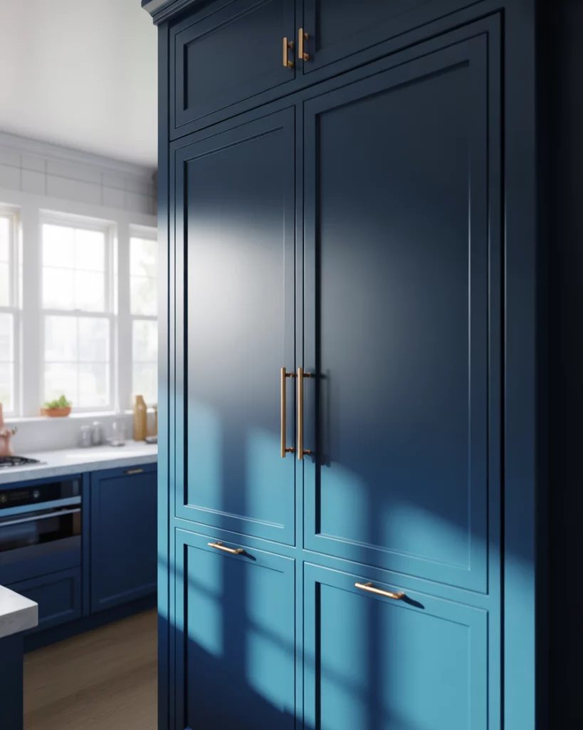Blue pantry cabinets are emerging as a standout color choice in pantry cabinet 2026 design. From navy to muted slate, blue adds depth while remaining timeless, especially when paired with warm woods. An expert-style note is to balance blue with lighter surroundings. This prevents the pantry from feeling heavy and keeps the kitchen visually open.