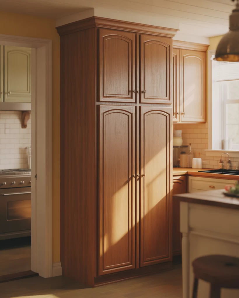 Freestanding pantry cabinets are trending as flexible, renter-friendly pantry cabinet 2026 options. These freestanding or standalone pieces often resemble armoires, blending easily into kitchens without full renovation. They’re especially popular for homes that need extra kitchen food storage ideas without permanent installation. A budget angle makes these appealing: many freestanding pantries cost less than custom cabinetry and can move with you. Homeowners often start with one piece and upgrade later, making it a low-risk way to test how much pantry space they actually use.