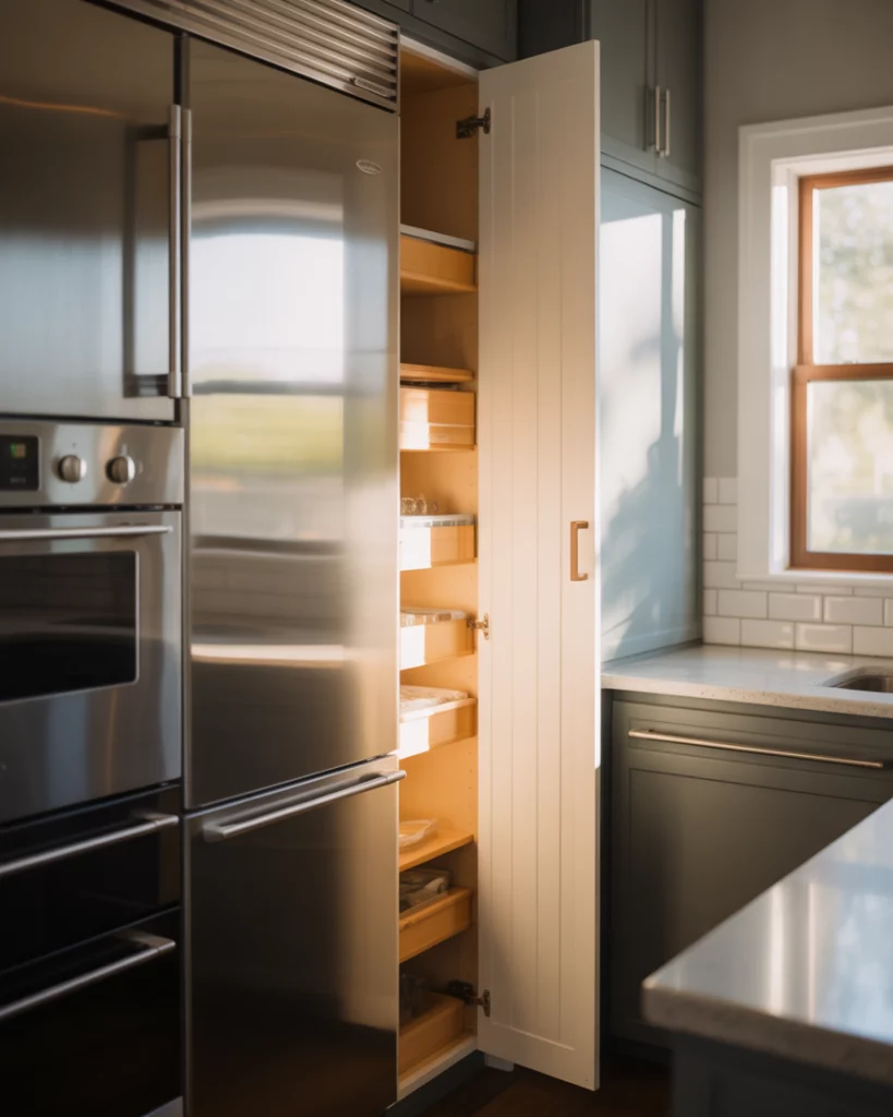 Placing a pantry cabinet next to the fridge is a smart layout move gaining traction in pantry cabinet 2026 designs. A built-in pantry next to refrigeration creates a natural food zone, streamlining cooking and unloading groceries. It keeps everything within arm’s reach while maintaining a clean visual line. From an expert-style perspective, grouping cold and dry storage reduces unnecessary steps during meal prep. Designers often recommend this layout for busy households because it supports intuitive movement and reduces kitchen traffic during peak hours.