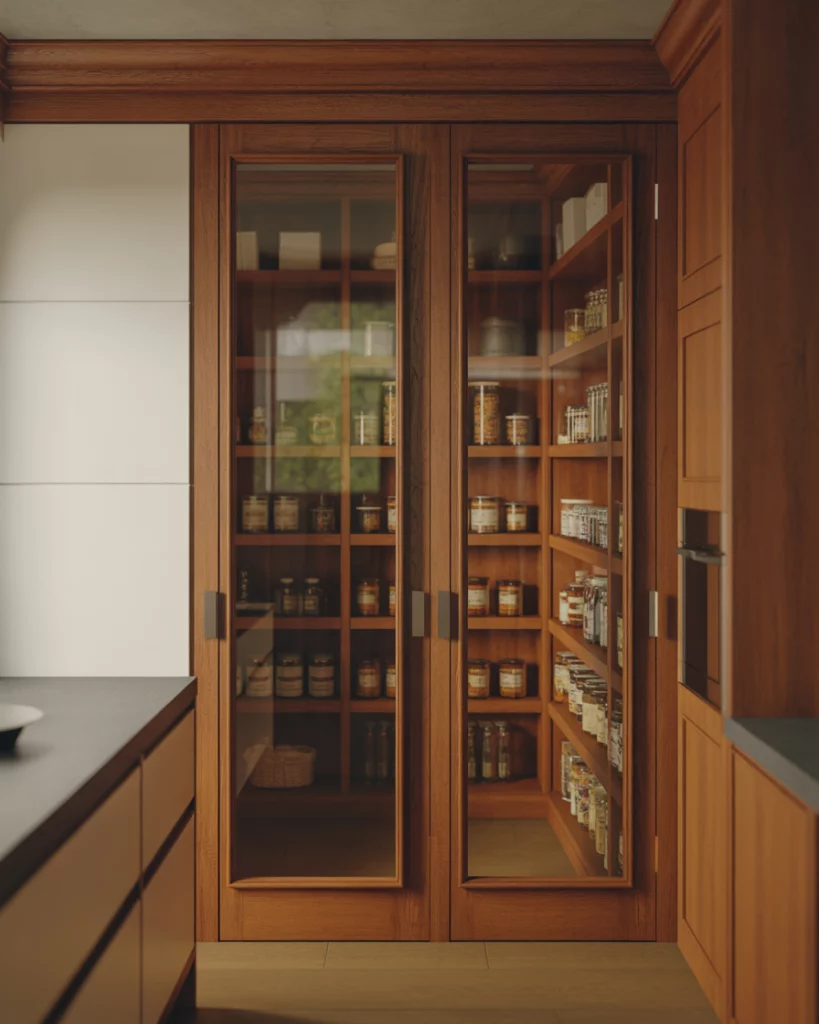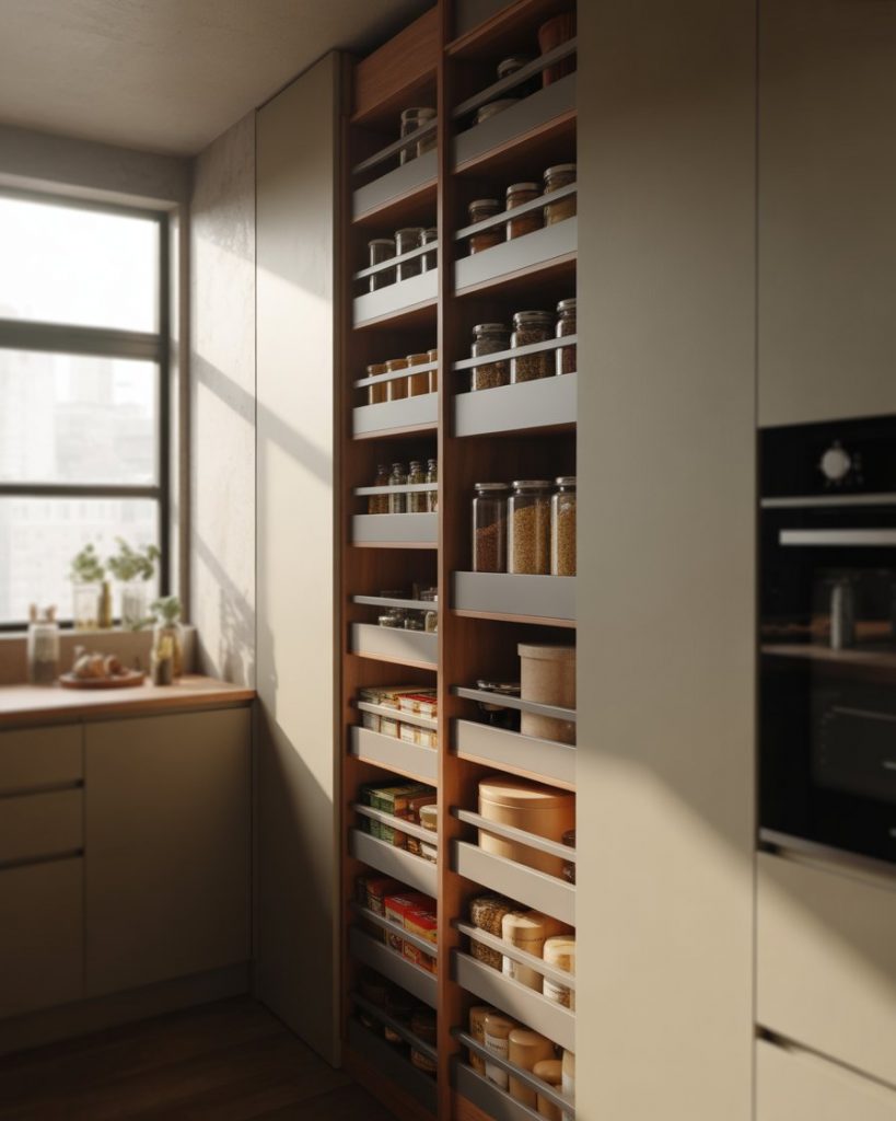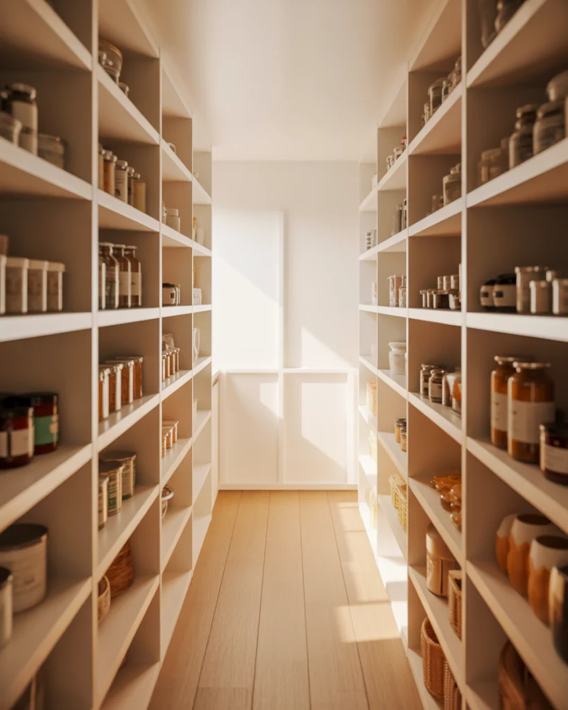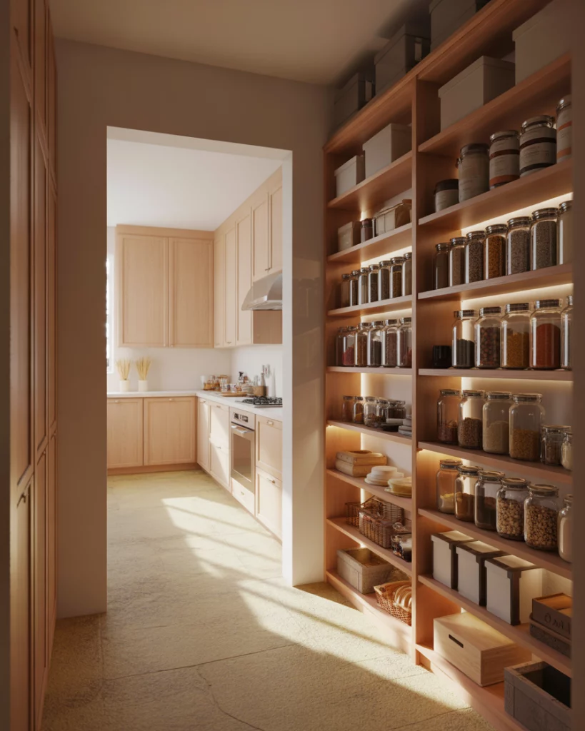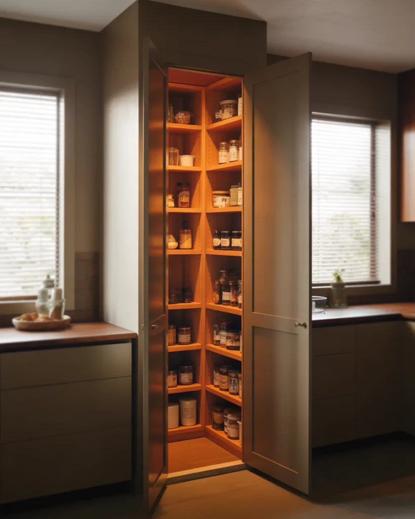 In compact apartments, a pantry designed for small spaces becomes a quiet workhorse of the kitchen. Narrow shelving, door-mounted storage, and smart layout choices allow even tight kitchens to stay organized. These pantries often blend into cabinetry, keeping visual clutter to a minimum. Where this works best is in city apartments where every square foot matters. By keeping pantry depth shallow and vertical, homeowners gain storage without compromising walkways or prep space.