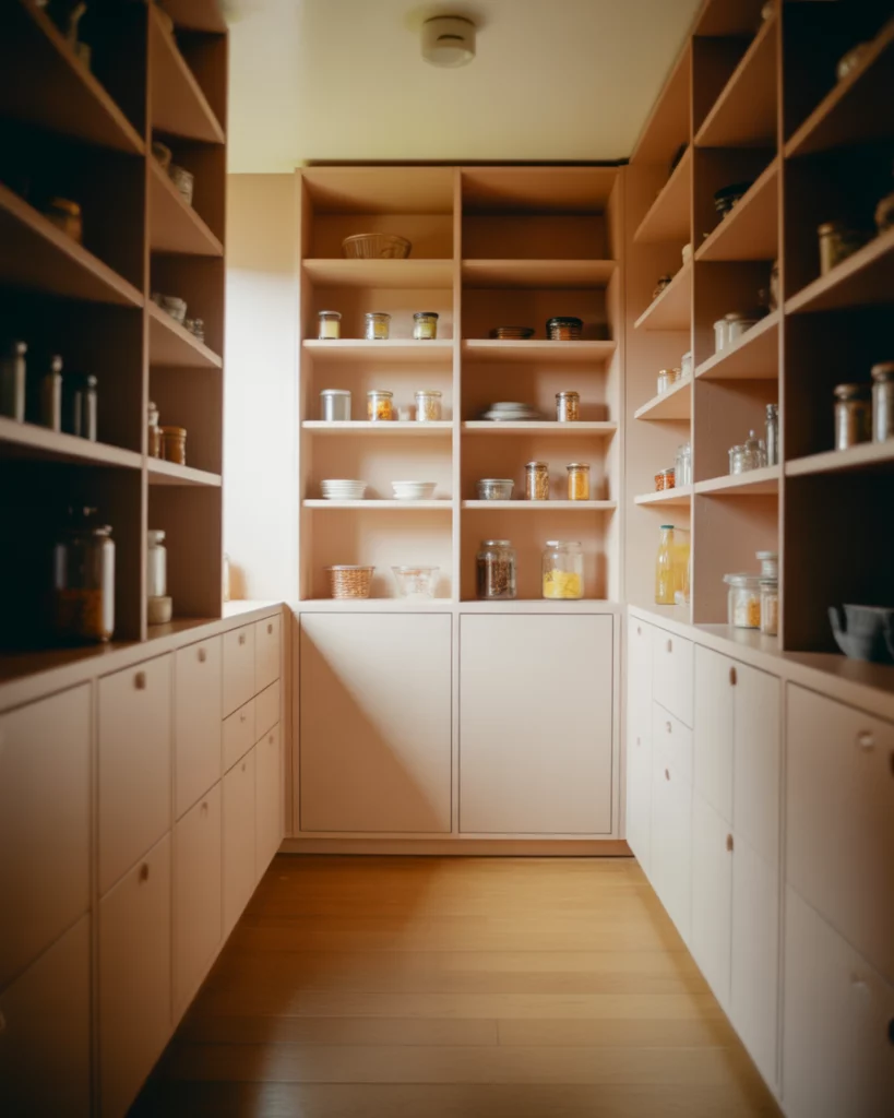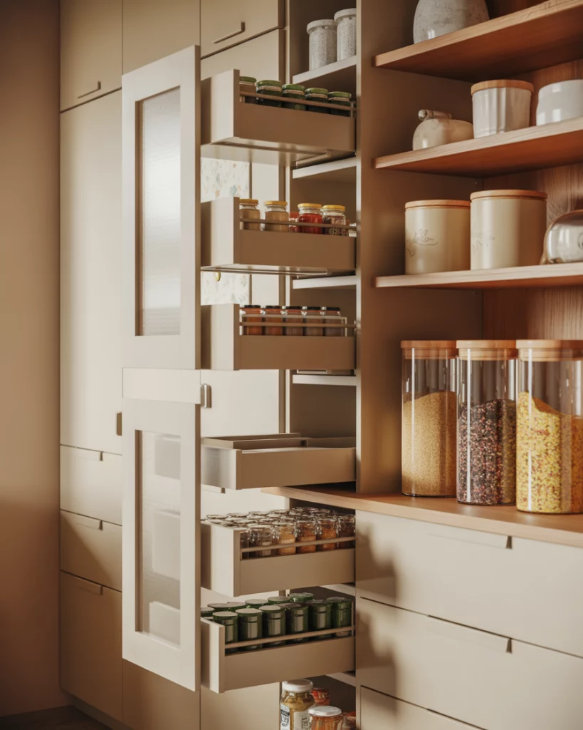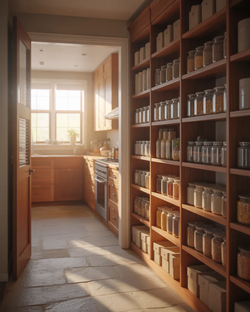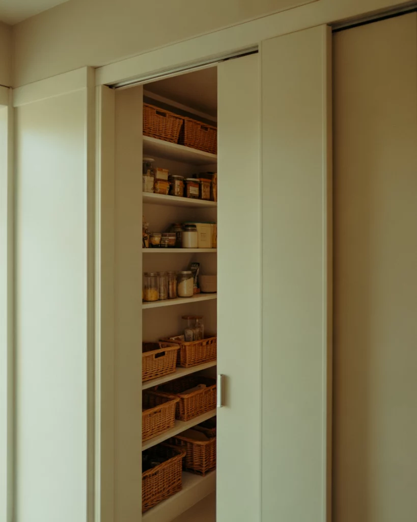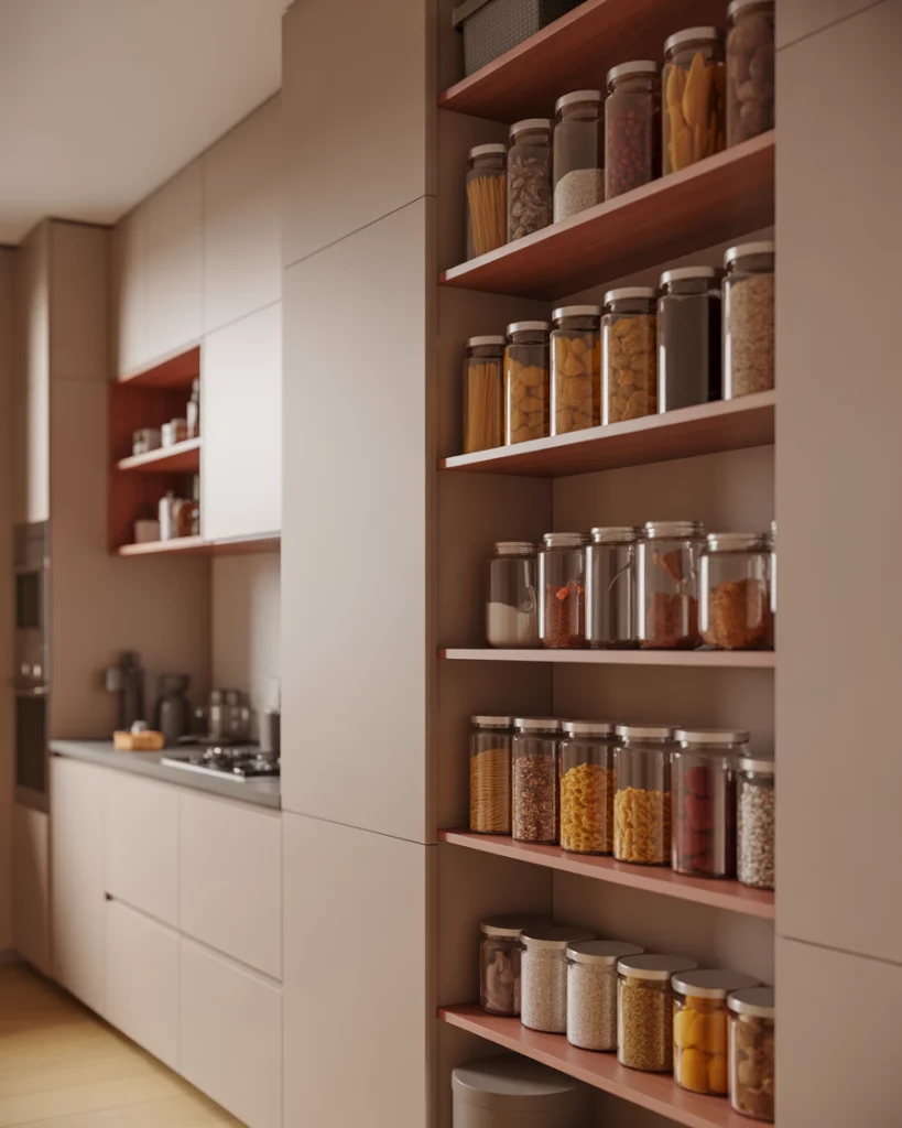 In compact apartments, a pantry designed for small spaces becomes a quiet workhorse of the kitchen. Narrow shelving, door-mounted storage, and smart layout choices allow even tight kitchens to stay organized. These pantries often blend into cabinetry, keeping visual clutter to a minimum. Where this works best is in city apartments where every square foot matters. By keeping pantry depth shallow and vertical, homeowners gain storage without compromising walkways or prep space.