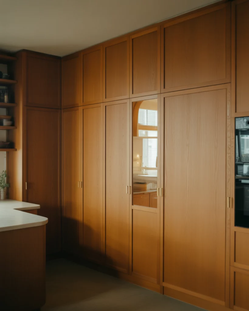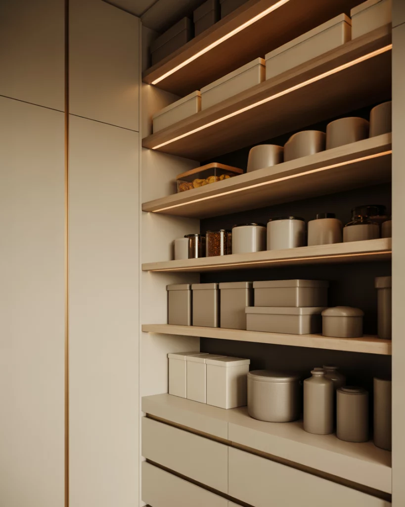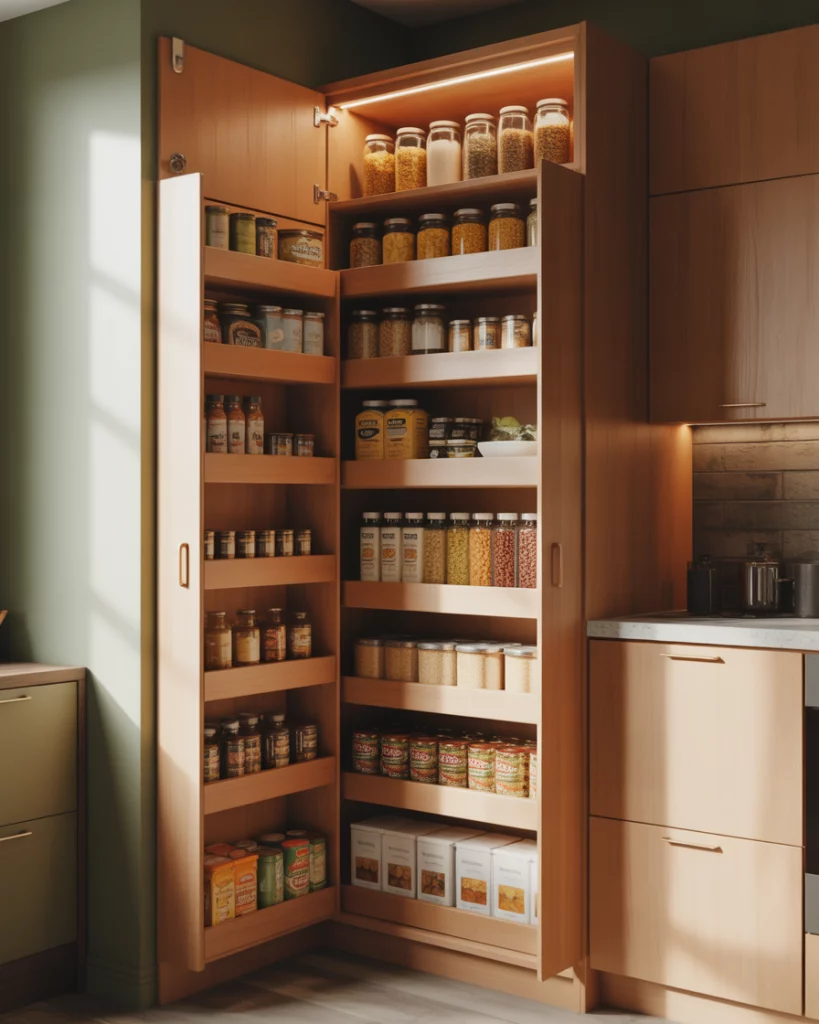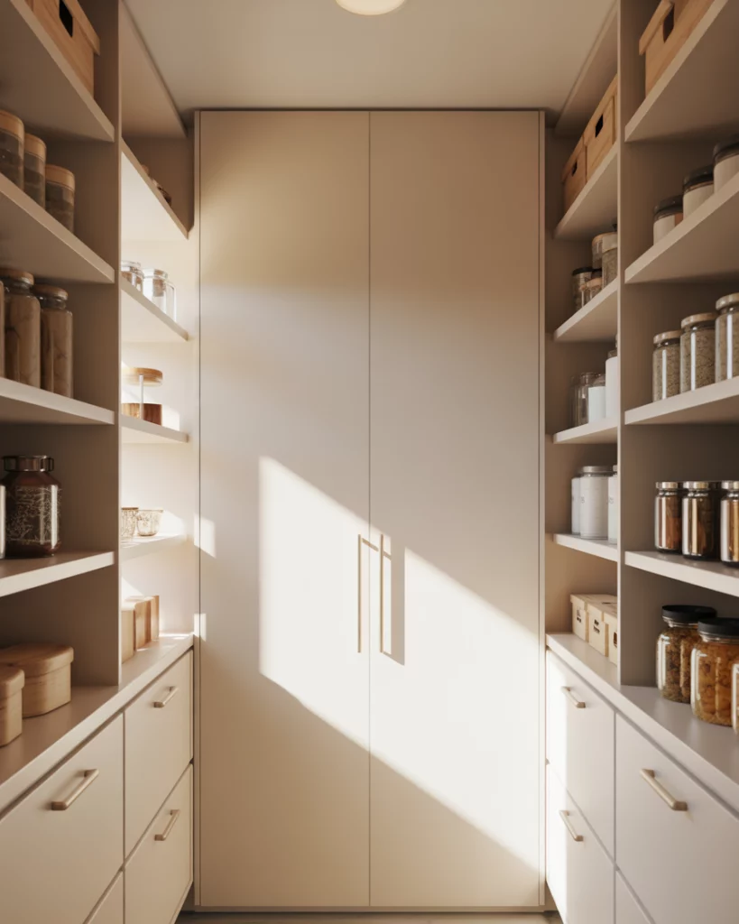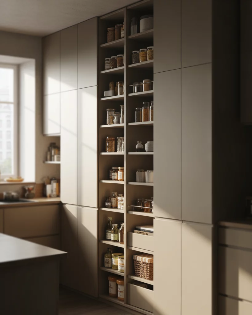 In L- or U-shaped kitchens, a dedicated pantry wall creates visual balance. Using full-height cabinets and hidden doors, the pantry reads as part of the architecture rather than an add-on. This approach keeps the kitchen feeling cohesive. Expert-style commentary often emphasizes alignment. When cabinet lines and finishes match, the pantry disappears visually, making even busy kitchens feel calmer.
