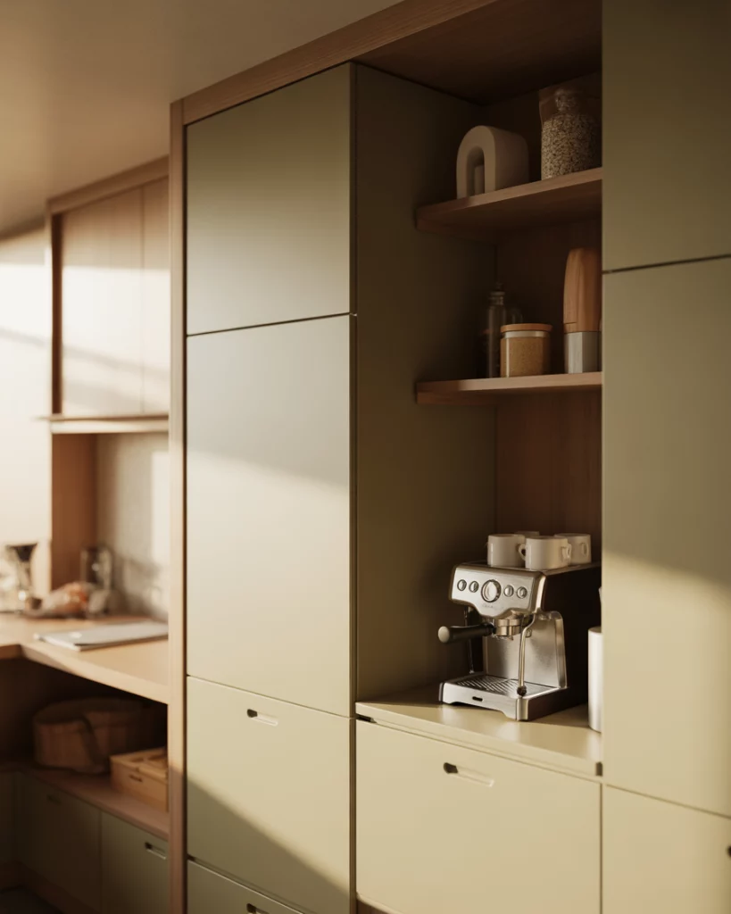 As work-from-home remains common, pantry spaces near a small office are gaining attention. This setup supports coffee breaks, snack storage, and lunch prep without interrupting the main home kitchen. It’s a subtle but meaningful shift in pantry placement. A small micro-anecdote often comes up: homeowners mention fewer kitchen interruptions during work hours. Having snacks nearby keeps focus intact and reduces daily friction.