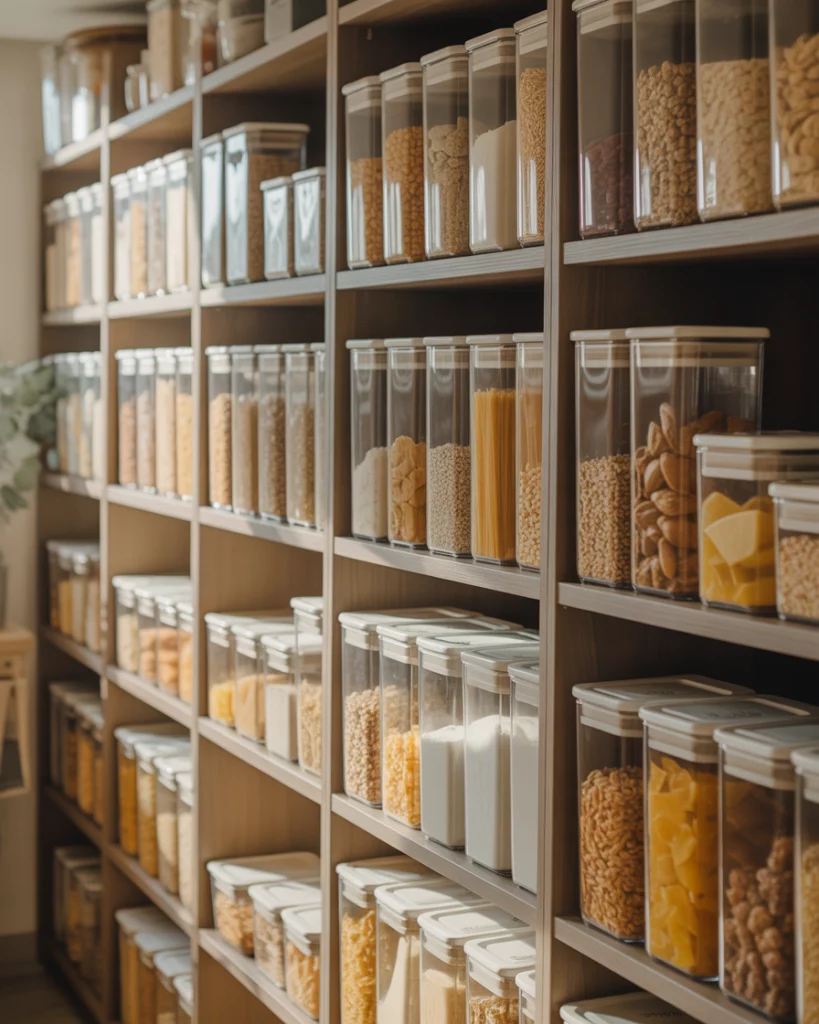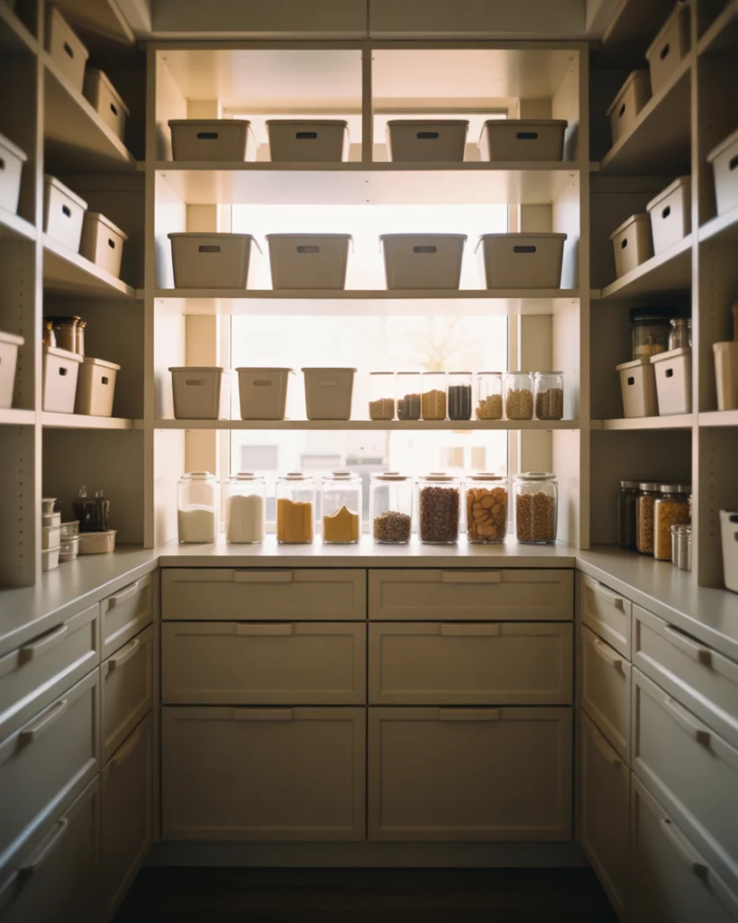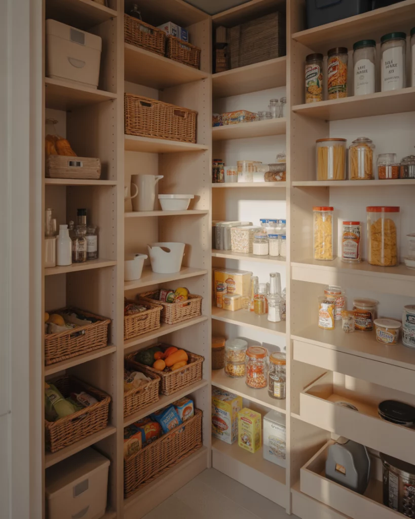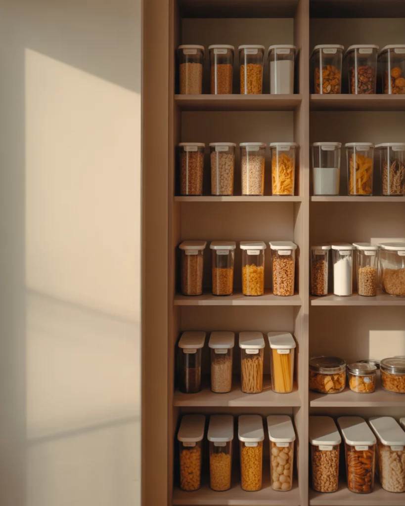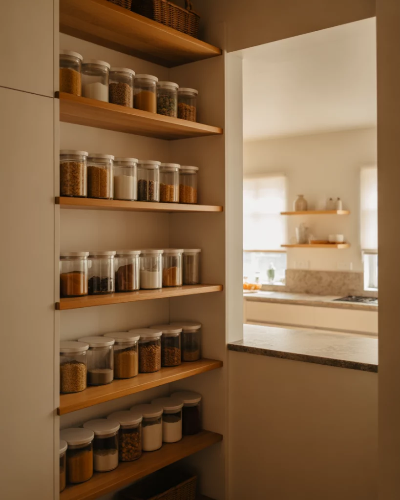 A dedicated dry goods pantry focuses on clarity and separation. Clear bins, labeled shelves, and consistent spacing help households manage staples efficiently, especially in busy home kitchens. Where it works best is in households that buy in bulk. Zoning prevents overbuying and makes inventory checks quick and intuitive.