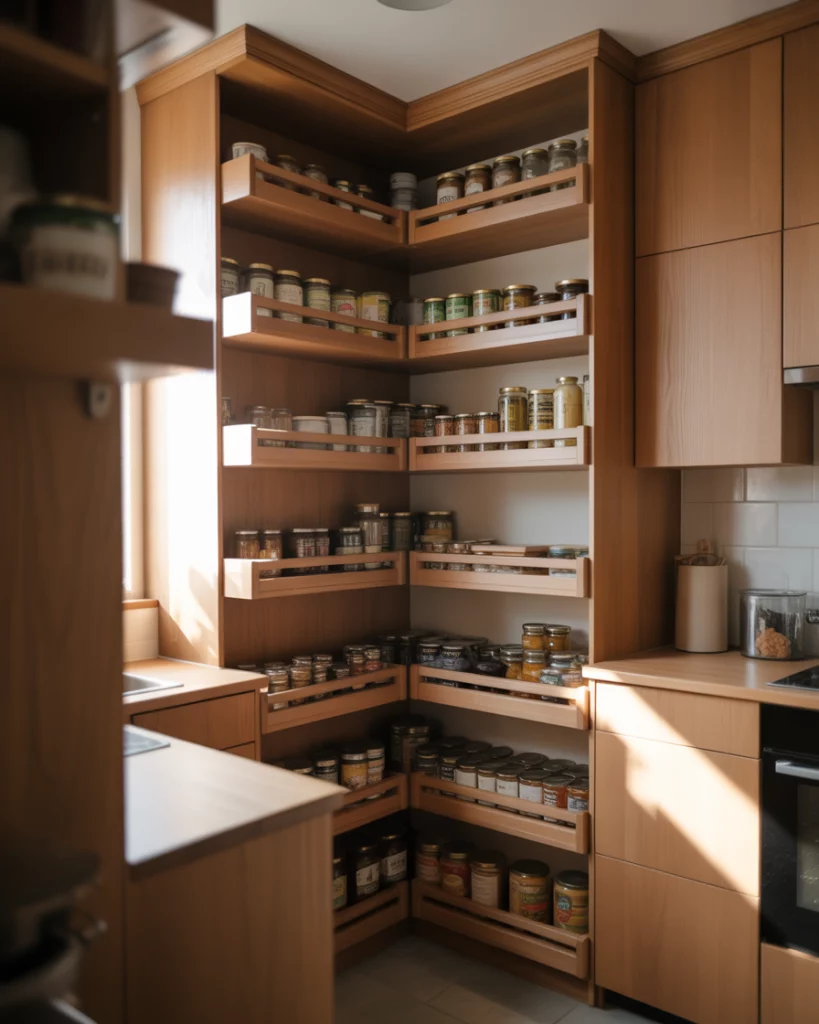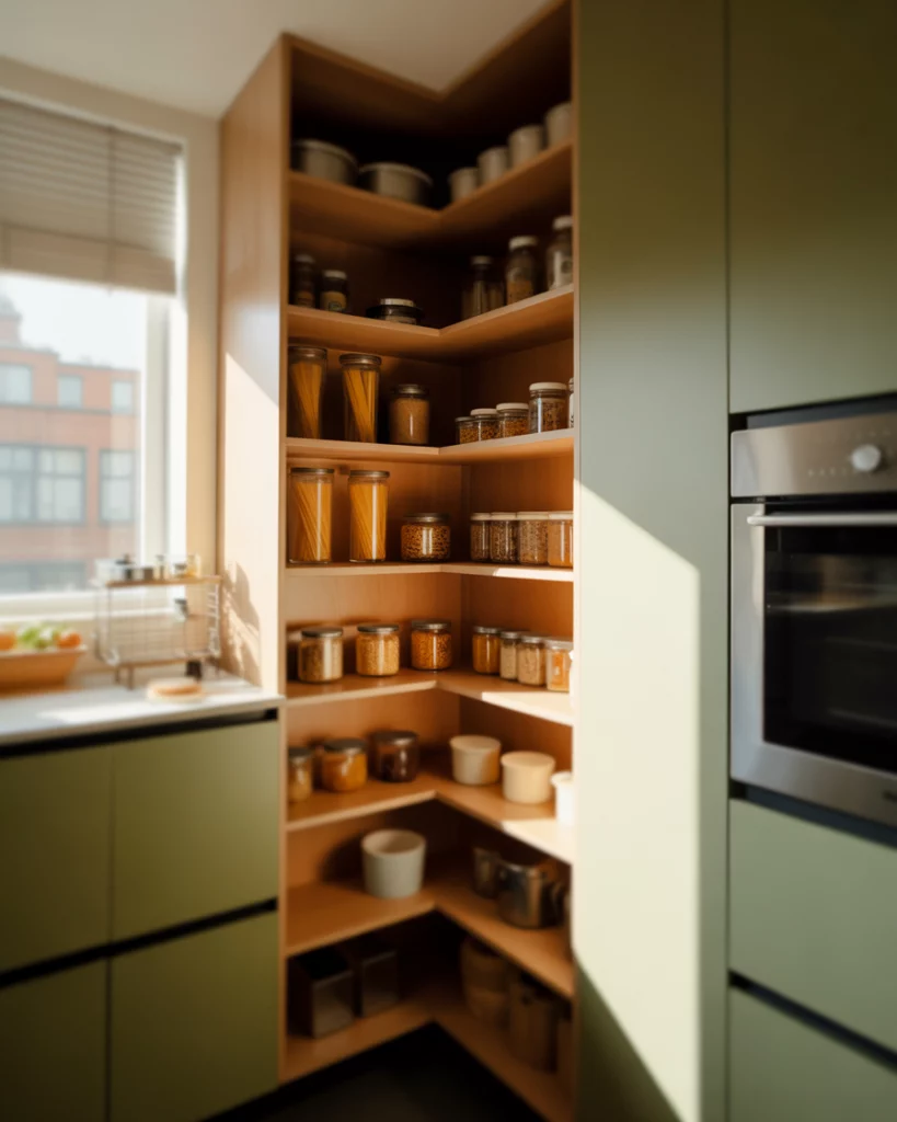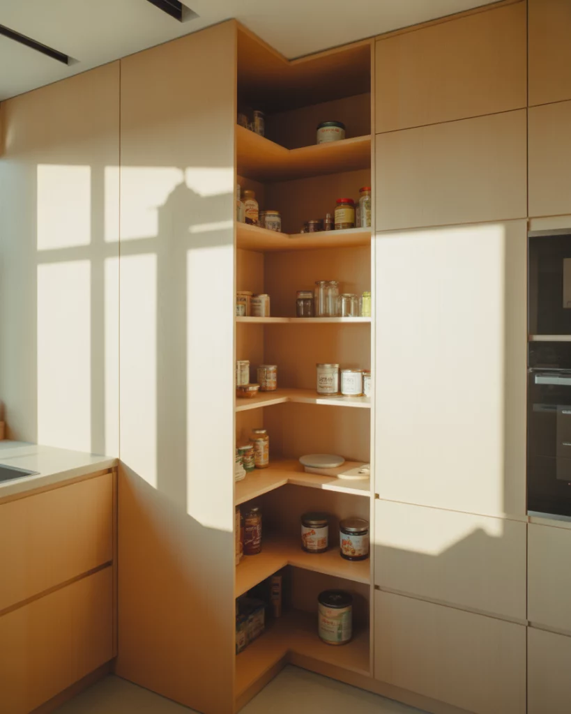 A small corner pantry can solve storage issues in a small kitchen. Rotating shelves, angled doors, or compact walk-ins transform corners into highly usable zones that would otherwise go unused. A common mistake is ignoring lighting in corners. Adding even subtle illumination prevents dark zones and makes stored items easier to access.