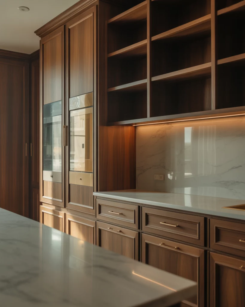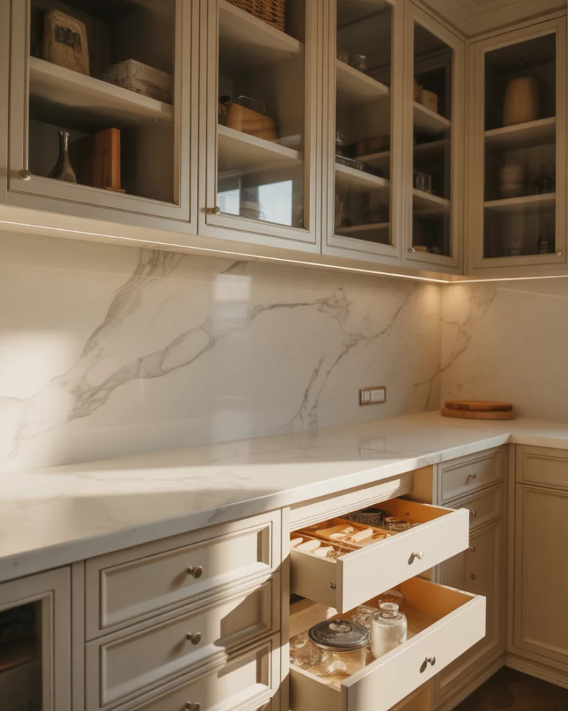 A luxury pantry often hides secondary appliances like microwaves or freezers. This keeps the modern luxury kitchen visually clean while supporting serious cooking and entertaining needs. Design professionals note that concealment is key. When appliances disappear behind panels, the pantry feels calm and intentional rather than overloaded.