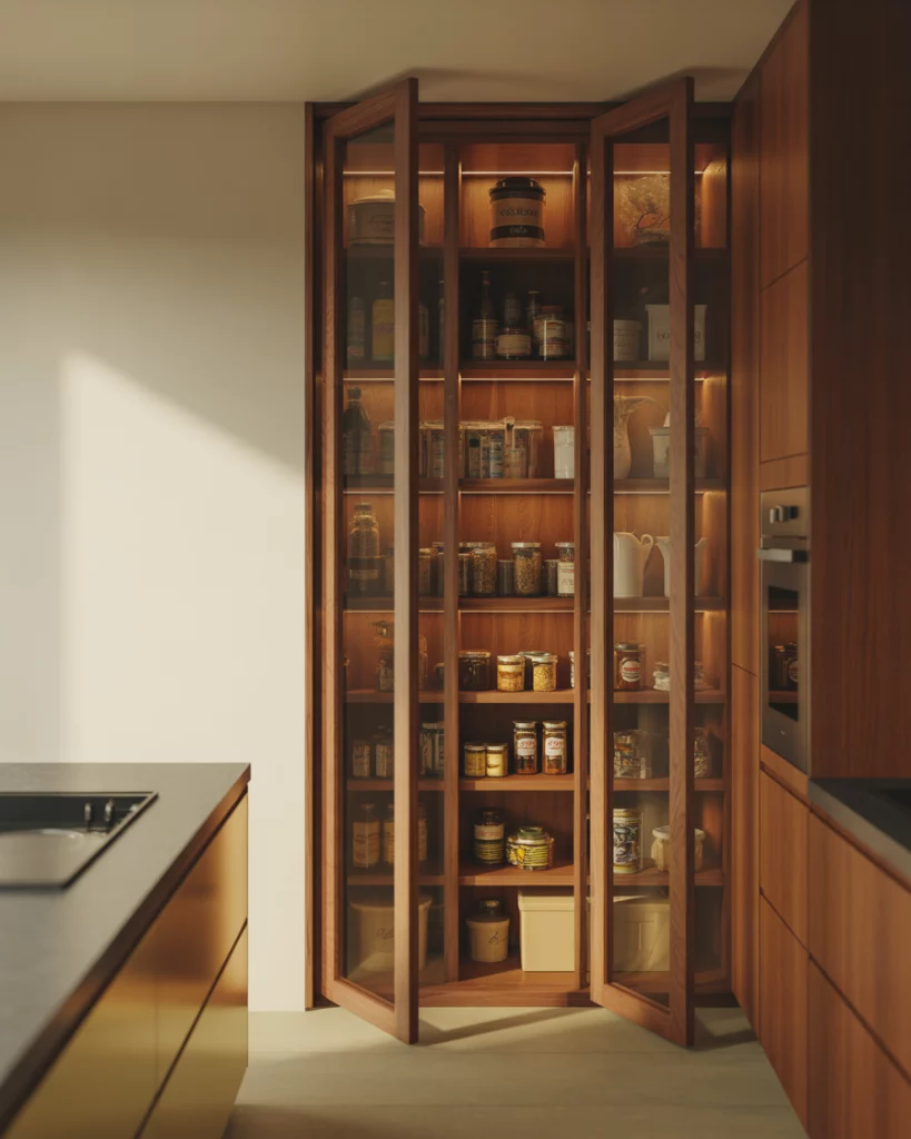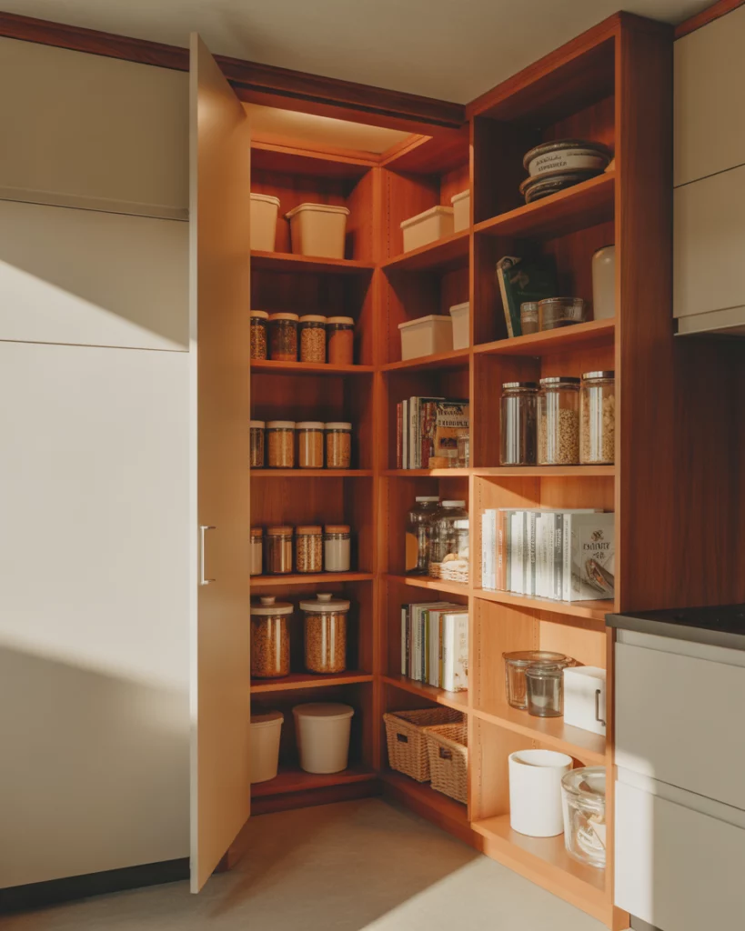 A corner kitchen pantry solves awkward layouts in shaped kitchens where wall space is limited. Angled doors, lazy shelves, or diagonal walk-ins transform unused corners into functional storage without disrupting circulation. A common mistake is overloading deep corner shelves. Keeping depths consistent and adding turntables prevents lost items. When corners are designed intentionally, they become some of the most efficient pantry zones.