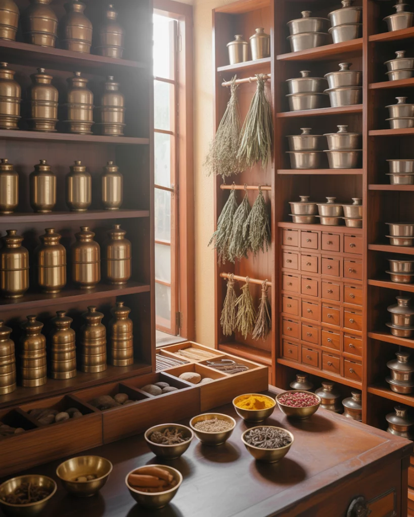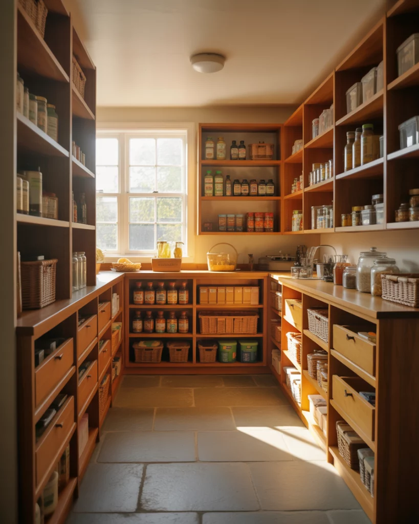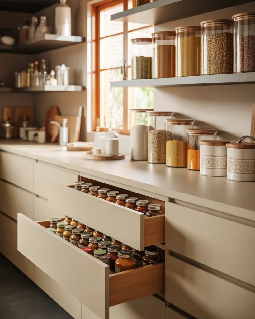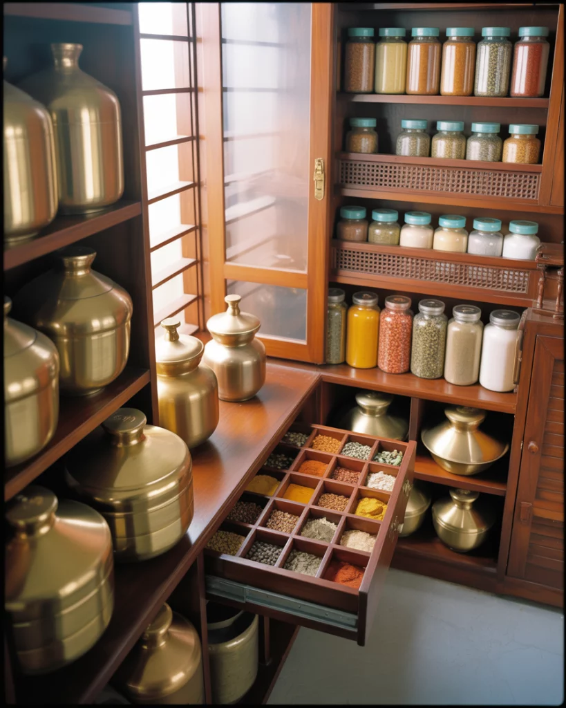 An Indian kitchen pantry organizes spices, bulk storage, and airflow. In American homes, these ideas influence pantry ideas with ventilated shelving, metal containers, and clear zoning for grains and spices. The practical takeaway is adaptability as a design principle. Balanced ingredient bulk buying and batching cooking pantry design help manage inventory. These pantries serve households that do scratch cooking several times a week.