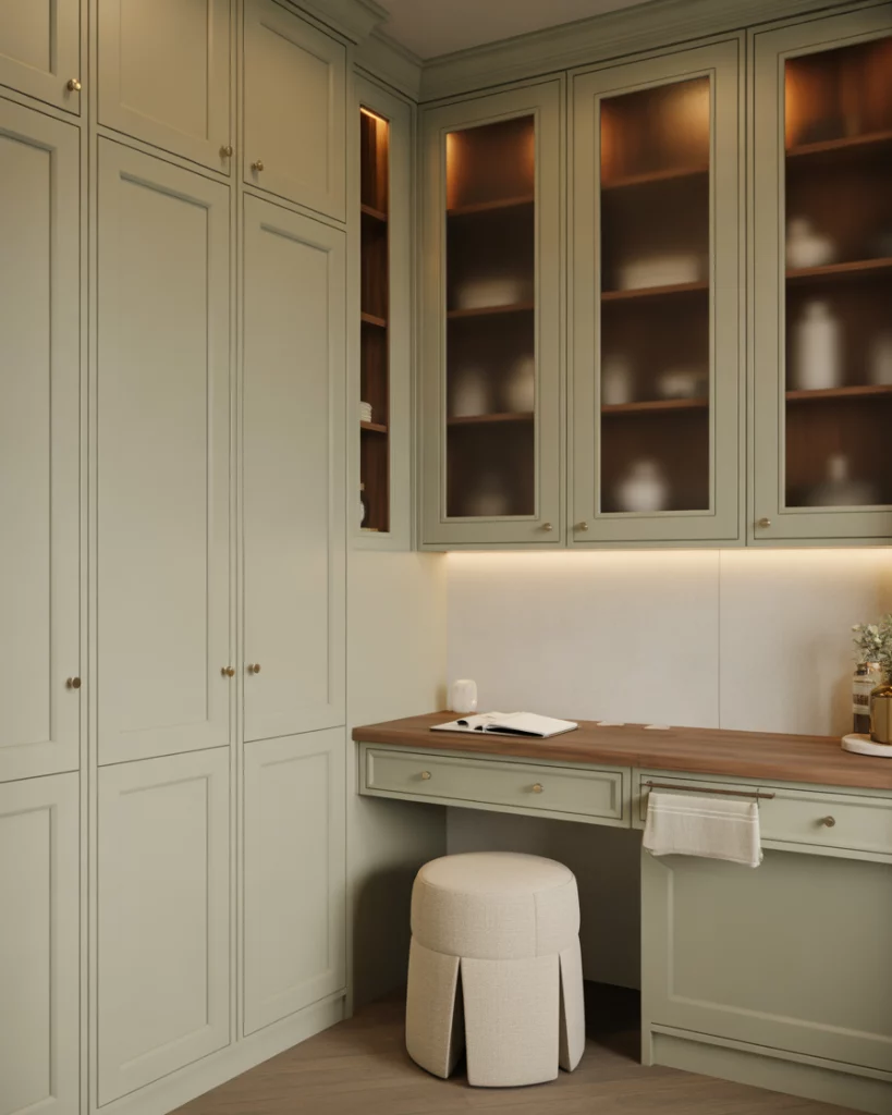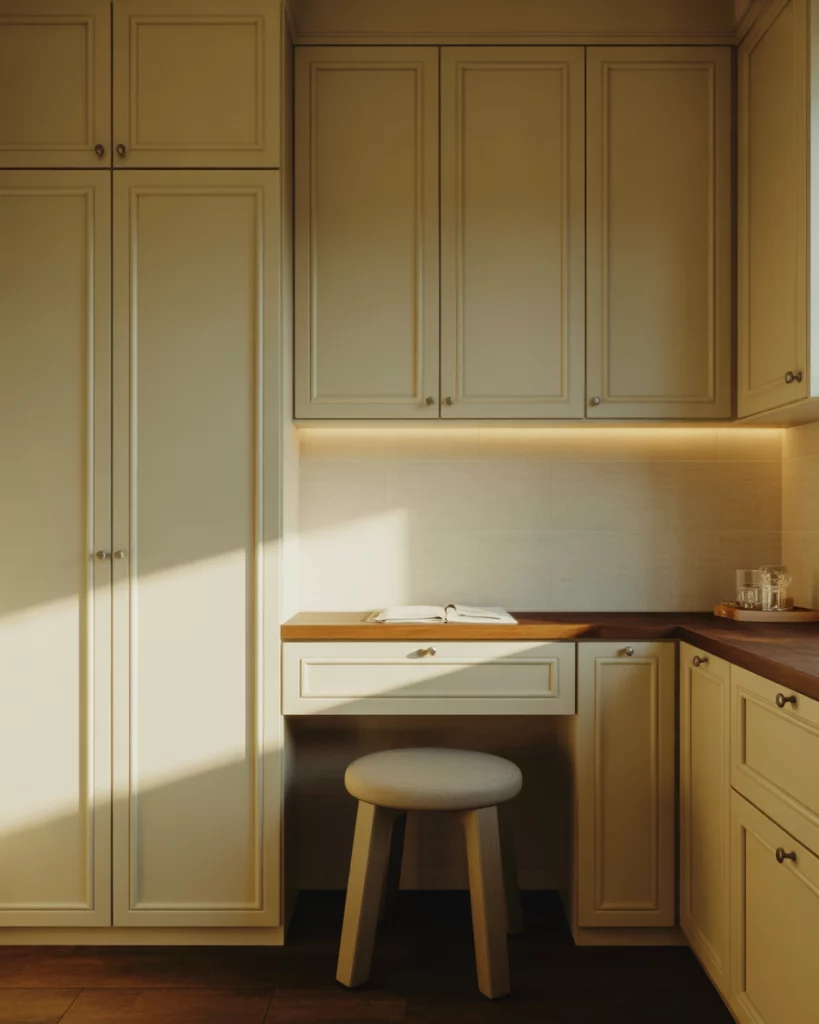 The contemporary butler pantry is transforming into a hybrid space, frequently combining with a small office or planning station. Closed cabinetry offers pantry supplies, while a small work surface accommodates a laptop, recipe planning, or a coffee station. This hybrid space illustrates the new multifunctional role of kitchens. A micro example of this is one homeowner who described how her pantry desk became the family’s “quiet corner” during remote work days. It’s not about replacing an office, but about creating a flexible space to respond to a variety of daily functions.