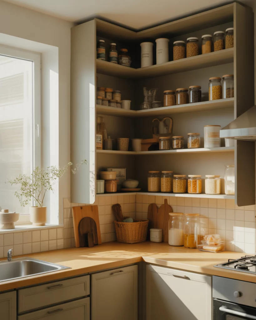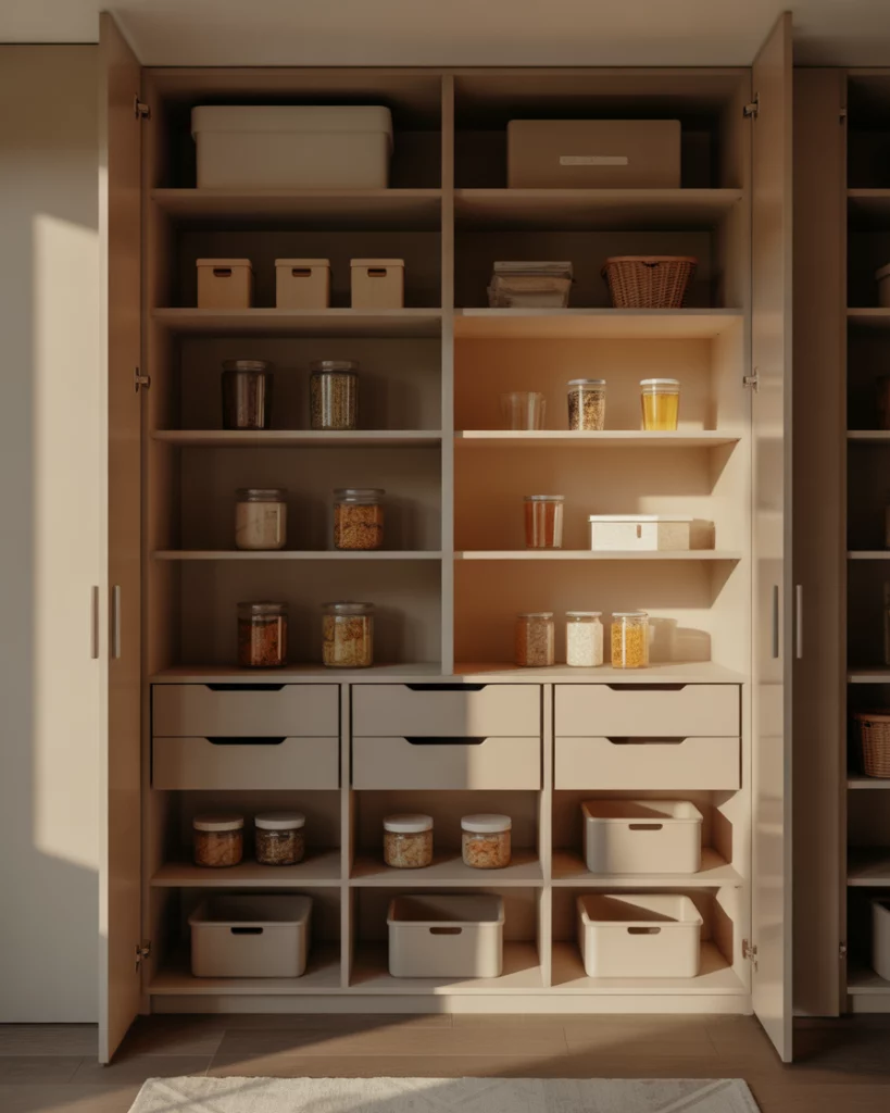 In a small kitchen, pantry organization in 2026 focuses on vertical storage and smart inserts. Slim shelving, hidden pull-out units, and adaptable ideas for small kitchens make it possible to store more without overwhelming tight layouts. A common mistake is overfilling narrow pull-outs with mismatched packaging. Keeping similar items grouped and leaving a little breathing room prevents jams and makes these systems feel smooth rather than frustrating during busy weekday cooking.
