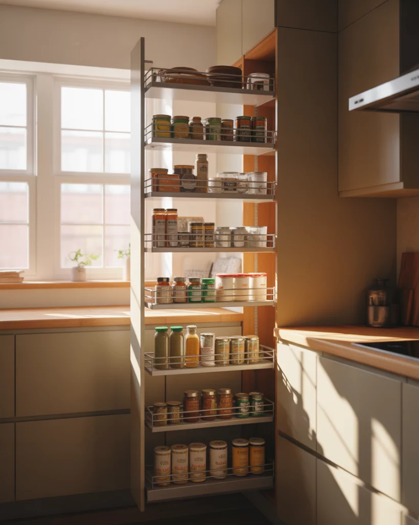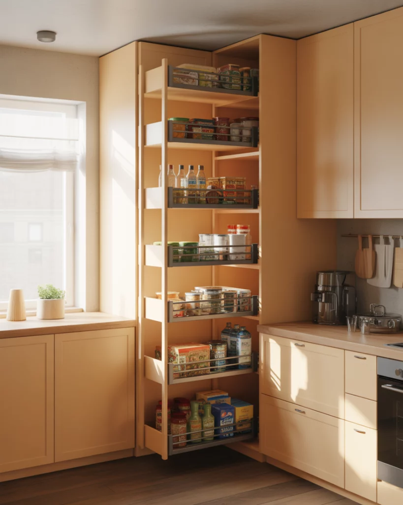 A tall pull-out pantry cabinet transforms awkward gaps into high-function storage. In a modern kitchen, these units bring visibility and order while keeping clutter tucked neatly behind closed doors. Experts often recommend measuring items before installation. Designing shelf heights around real groceries prevents wasted space and keeps pull-outs from becoming chaotic catchalls.