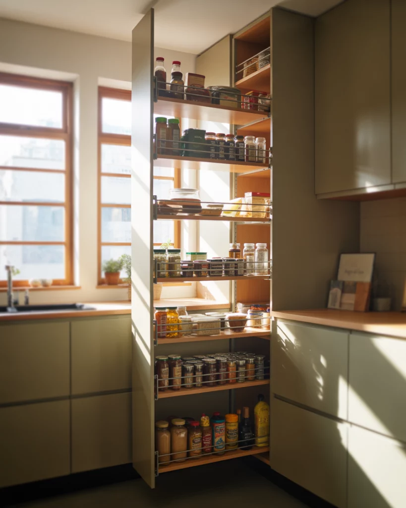 A tall pull-out pantry cabinet transforms awkward gaps into high-function storage. In a modern kitchen, these units bring visibility and order while keeping clutter tucked neatly behind closed doors. Experts often recommend measuring items before installation. Designing shelf heights around real groceries prevents wasted space and keeps pull-outs from becoming chaotic catchalls.