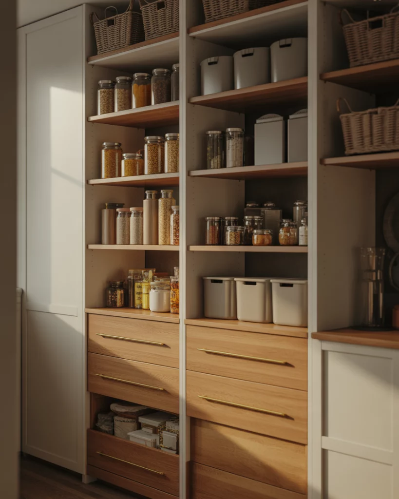 In a small kitchen, pantry organization in 2026 focuses on vertical storage and smart inserts. Slim shelving, hidden pull-out units, and adaptable ideas for small kitchens make it possible to store more without overwhelming tight layouts. A common mistake is overfilling narrow pull-outs with mismatched packaging. Keeping similar items grouped and leaving a little breathing room prevents jams and makes these systems feel smooth rather than frustrating during busy weekday cooking.
