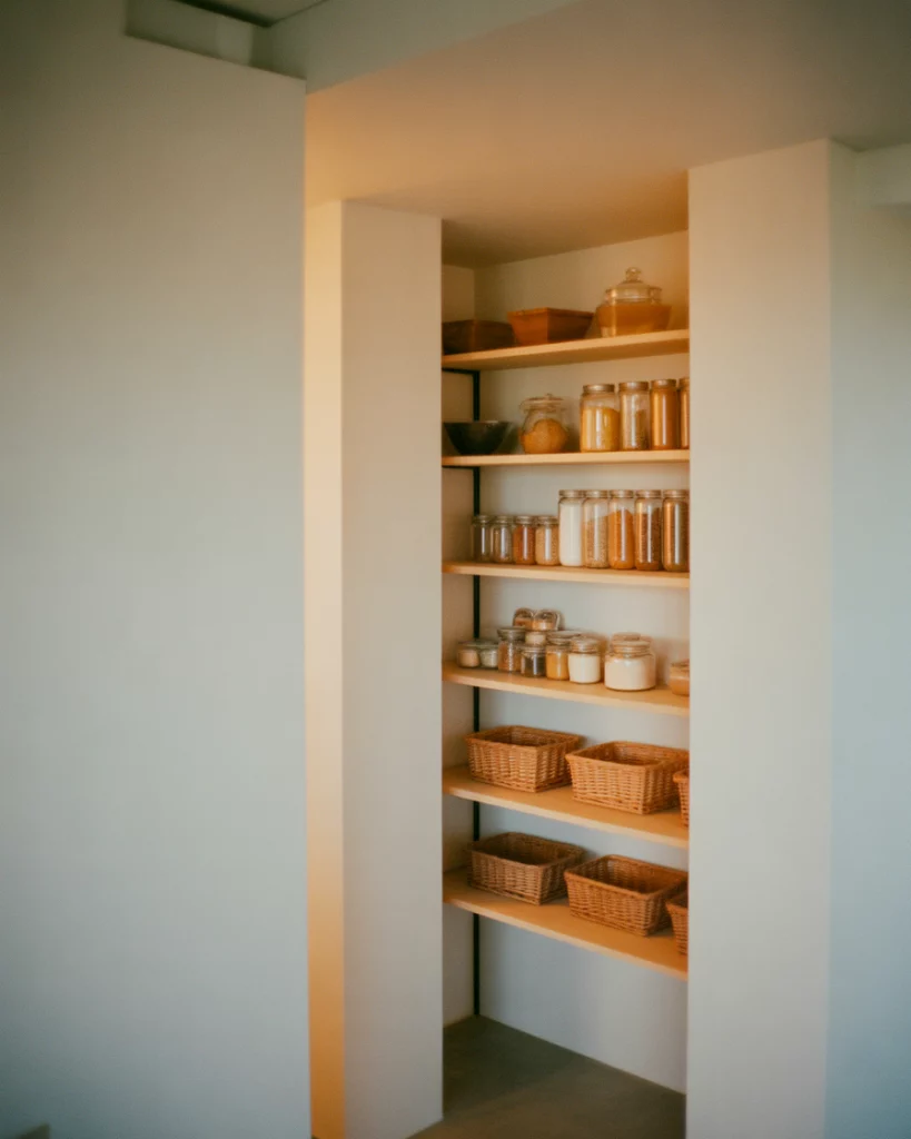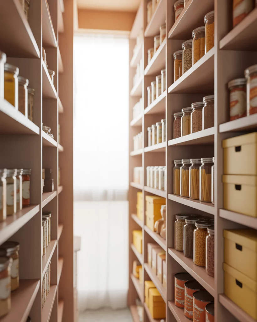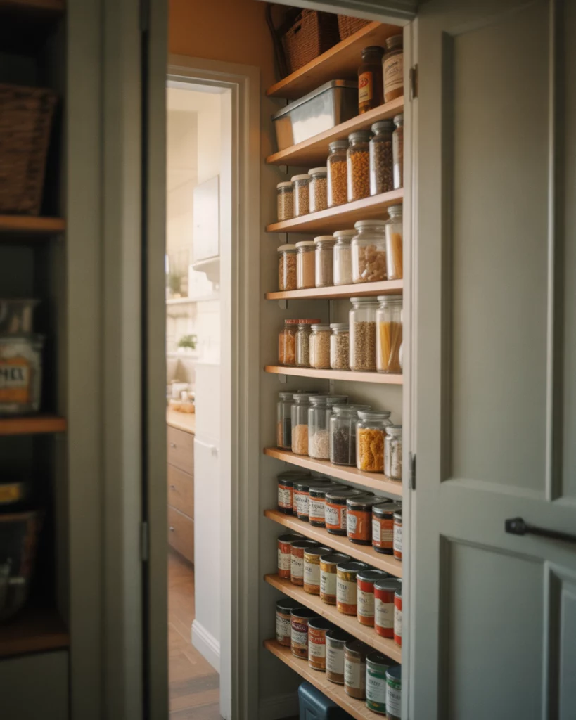 Repurposing a small closet into pantry storage is a growing trend. With a calm aesthetic and thoughtful shelf depth, these compact pantries feel intentional rather than improvised. A practical insight is to avoid deep shelves here. Shallow storage keeps everything visible and prevents forgotten items from expiring in the back.