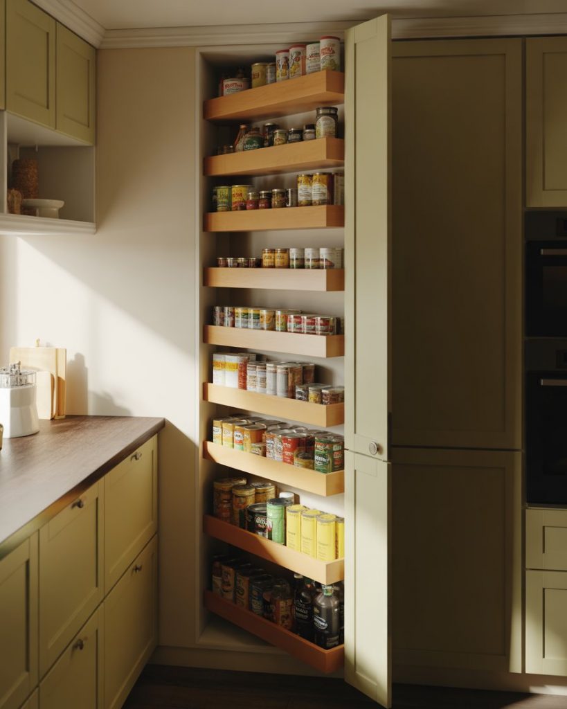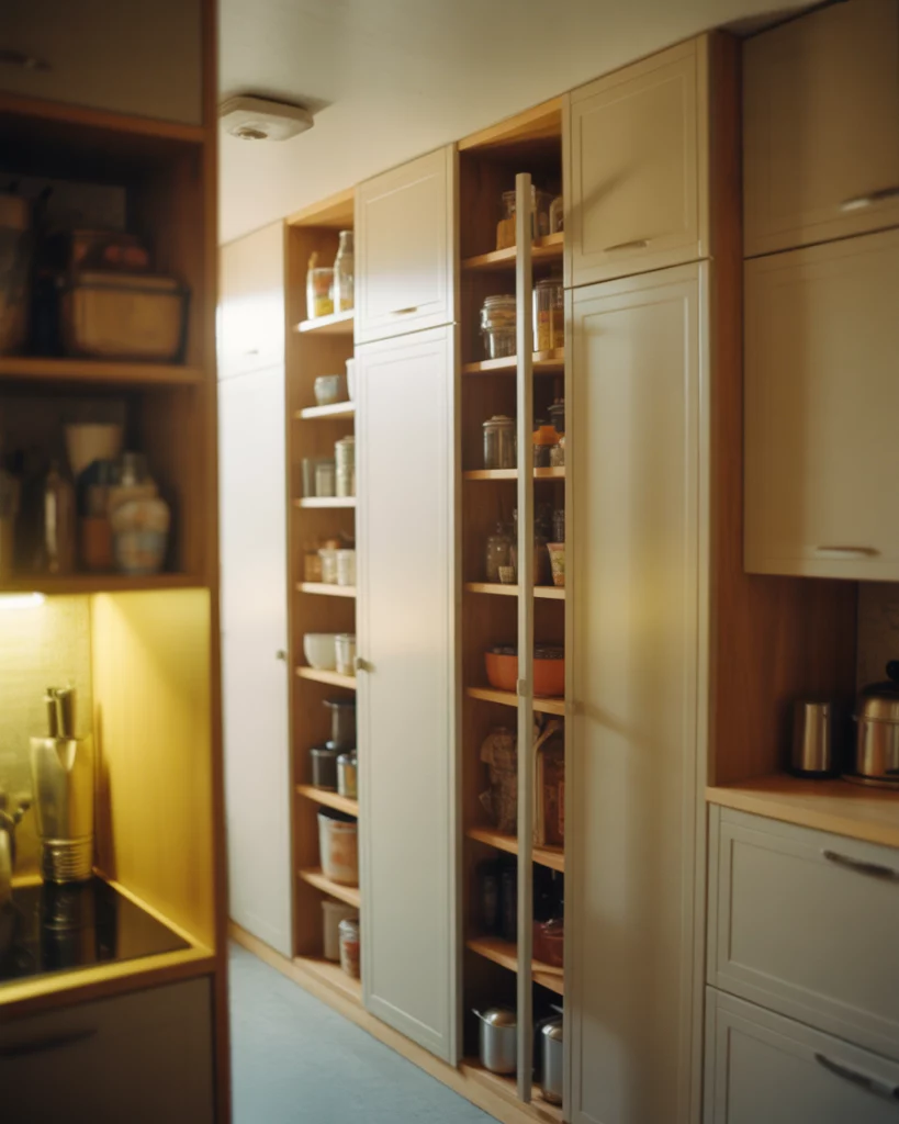 In a narrow kitchen, tall cabinets designed specifically for pantry use can replace multiple smaller storage areas. This approach streamlines organization while keeping food accessible without crowding the workspace. Where this works best is in city apartments and older homes. Consolidating pantry items into one vertical unit often frees up counter and drawer space elsewhere.