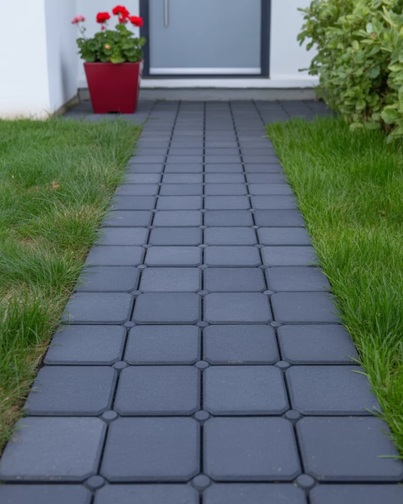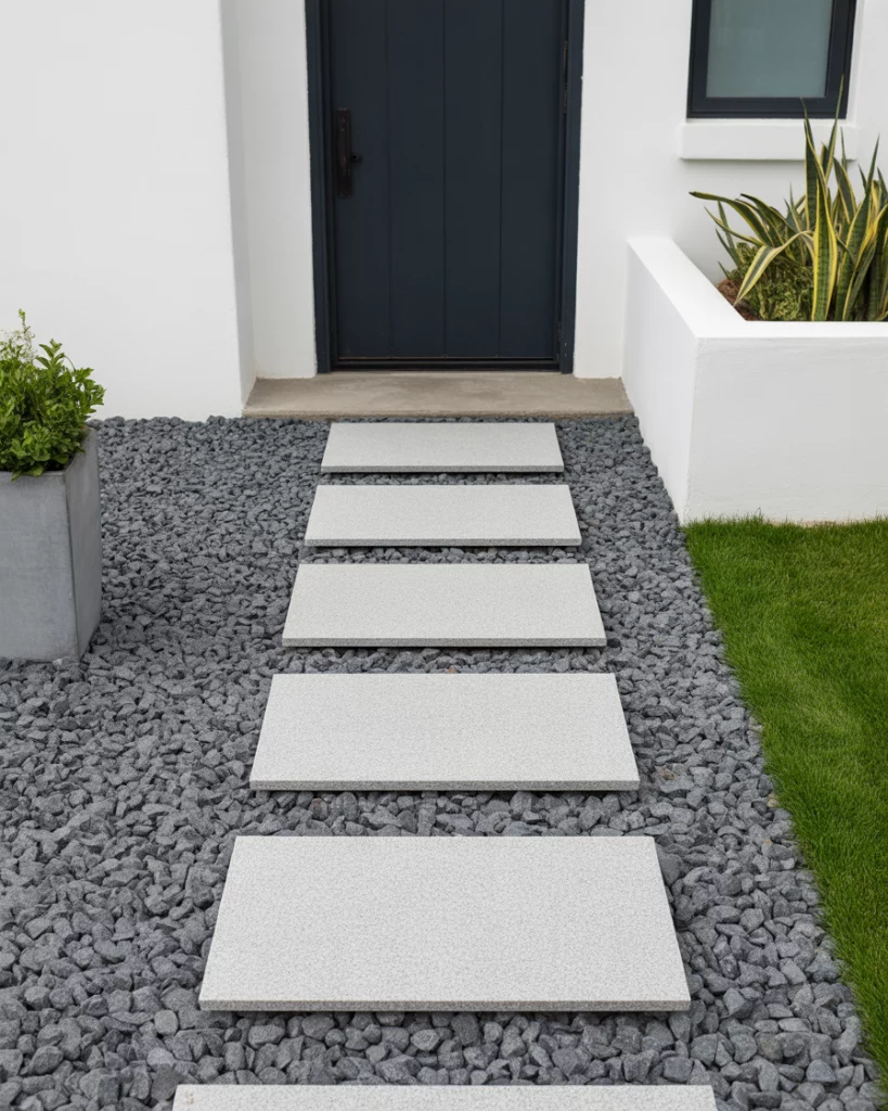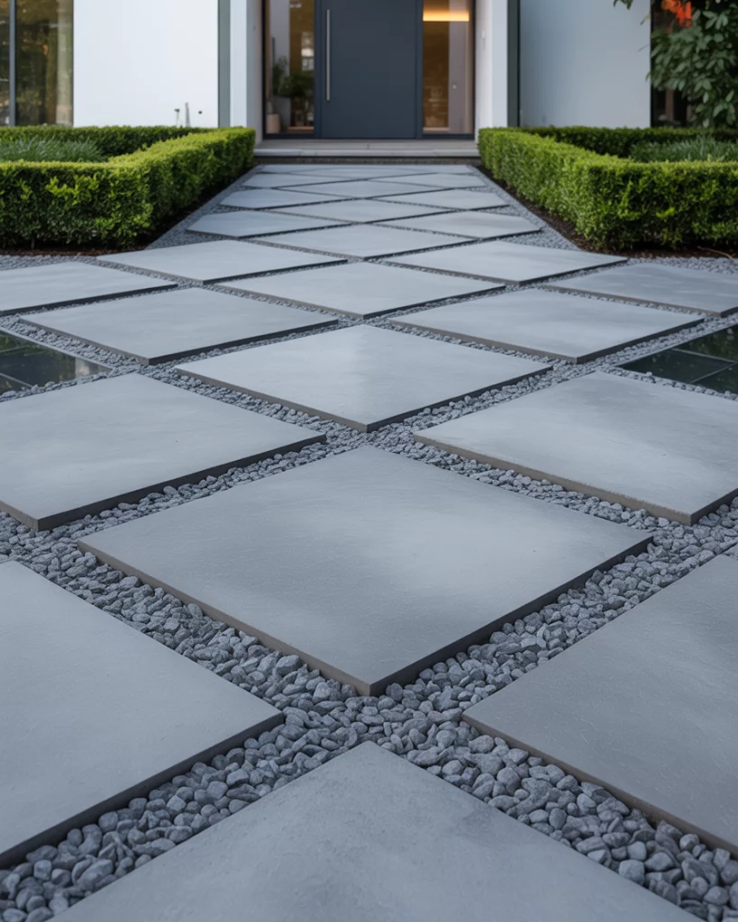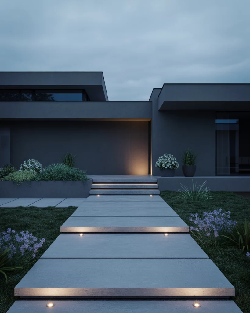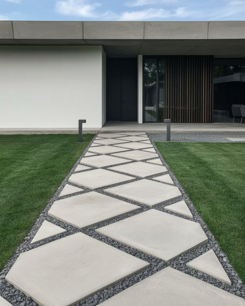 Long, narrow concrete pavers laid in a linear path feel sleek and purposeful—perfect for modern architecture. Install in-built pathway lights around the sides to make a passage during nighttime. This arrangement adds panache to any front entrance modern design particularly when it is bordered with symmetrically planted flowers or decorative grasses. It’s a favorite among house flippers and high-end builds looking for a minimalist edge.