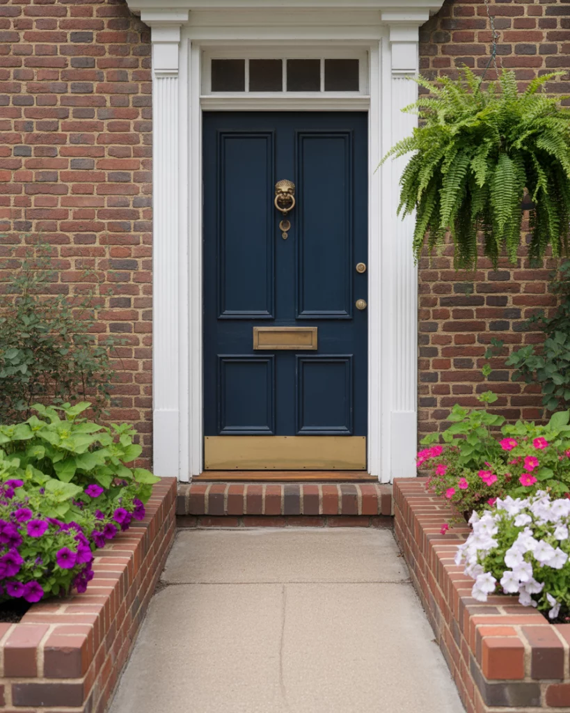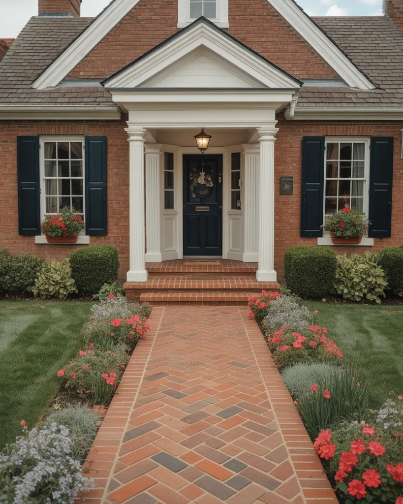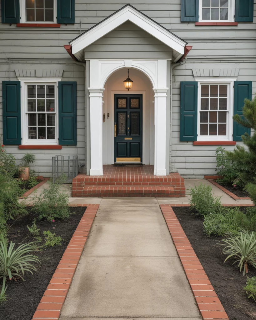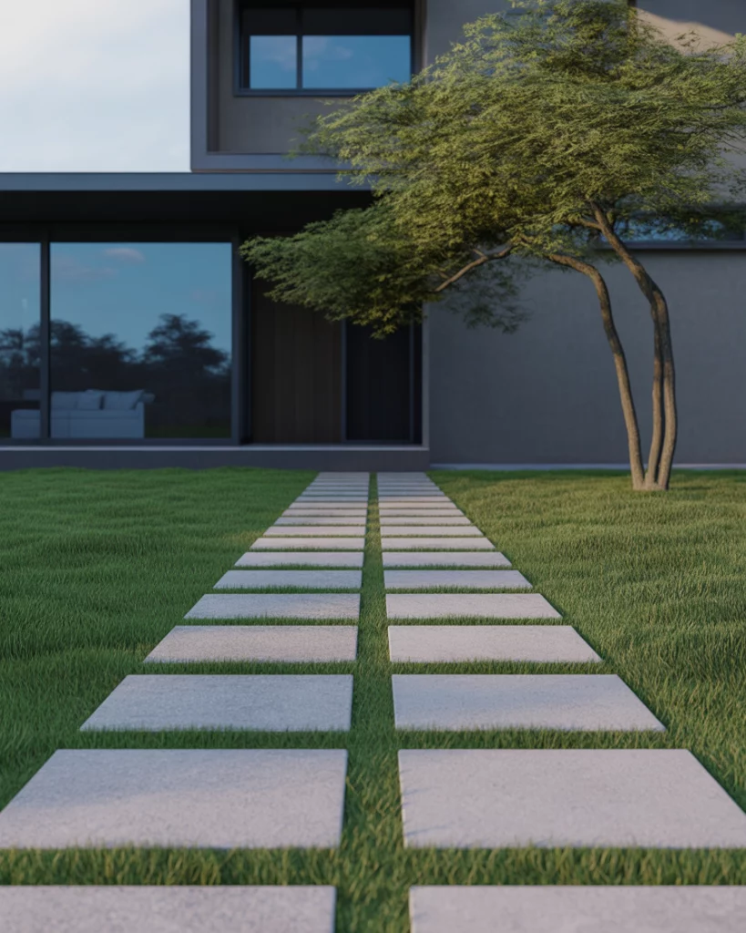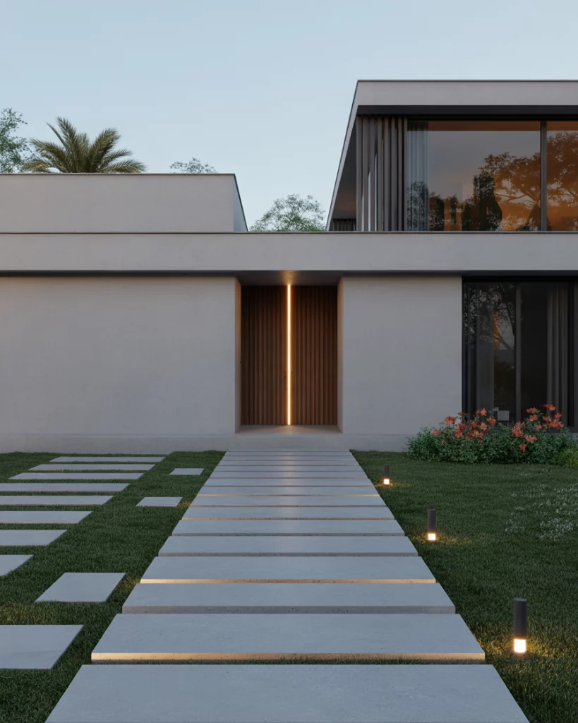 Long, narrow concrete pavers laid in a linear path feel sleek and purposeful—perfect for modern architecture. Install in-built pathway lights around the sides to make a passage during nighttime. This arrangement adds panache to any front entrance modern design particularly when it is bordered with symmetrically planted flowers or decorative grasses. It’s a favorite among house flippers and high-end builds looking for a minimalist edge.