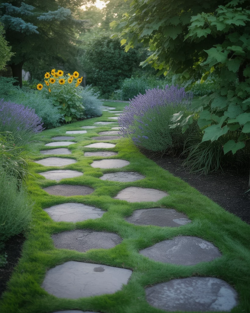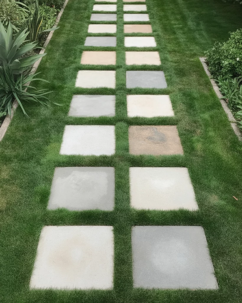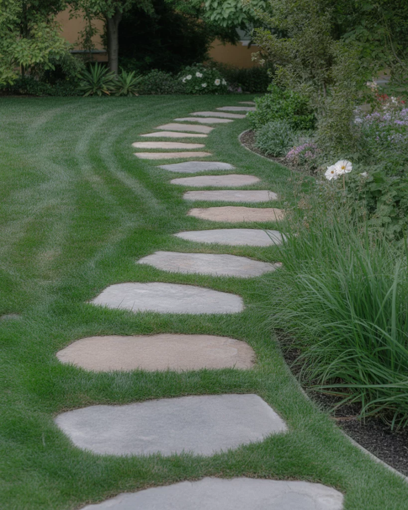 Using flat stone or large concrete stepping pads surrounded by grass creates a naturalistic and relaxed look, ideal for backyard or cottage-style house settings. The broad borders of grass allow the walk to integrate with the entire landscape particularly when you use irregular and neutral colored rocks. This design looks especially charming when winding through flowers or under small trees, giving the path an enchanted-garden feel.