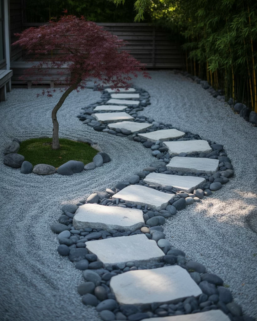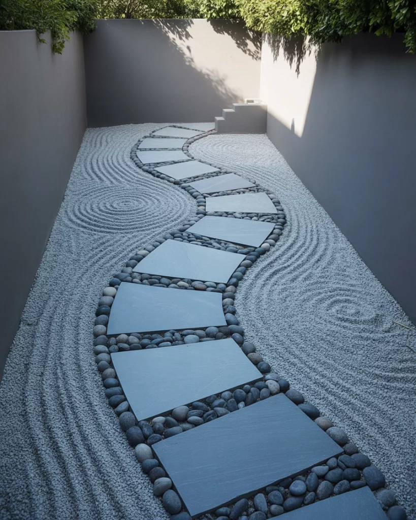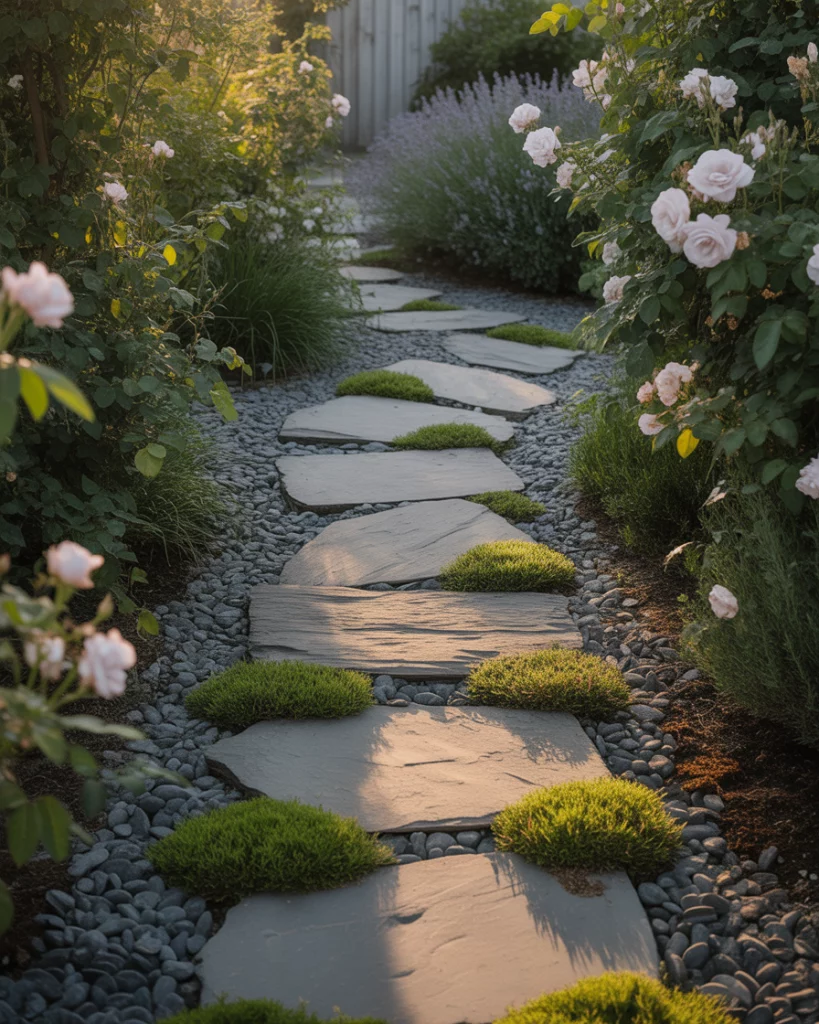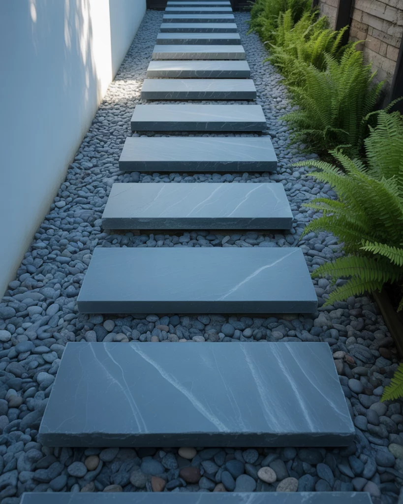 Floating stone or bluestone slabs placed over a bed of pea gravel or rocks create a Zen-inspired, slightly elevated walkway. This is particularly suitable in a side of house, or a narrow garden avenue. The contrast between the hard slab and loose gravel is striking and invites intentional foot placement, slowing the pace and increasing appreciation of the space.