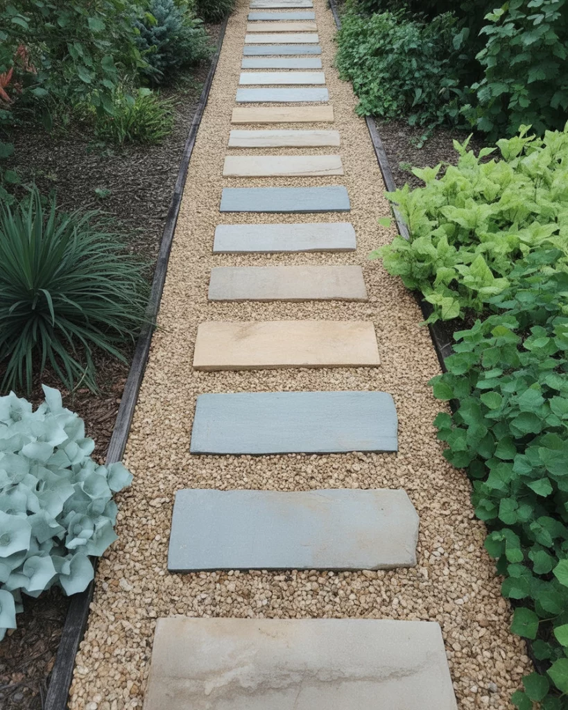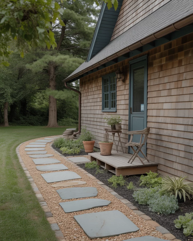 Using wide stone or granite slabs with pea gravel filling the gaps gives your walkway a rich, layered texture. It is a design that allows the path to breathe, and introduces an artisan-made vibe. A side of house or shaded back yard is ideal and the gravel helps drainage and the slabs keep walking smooth. This is one of those design ideas that brings a European garden vibe to an American setting.