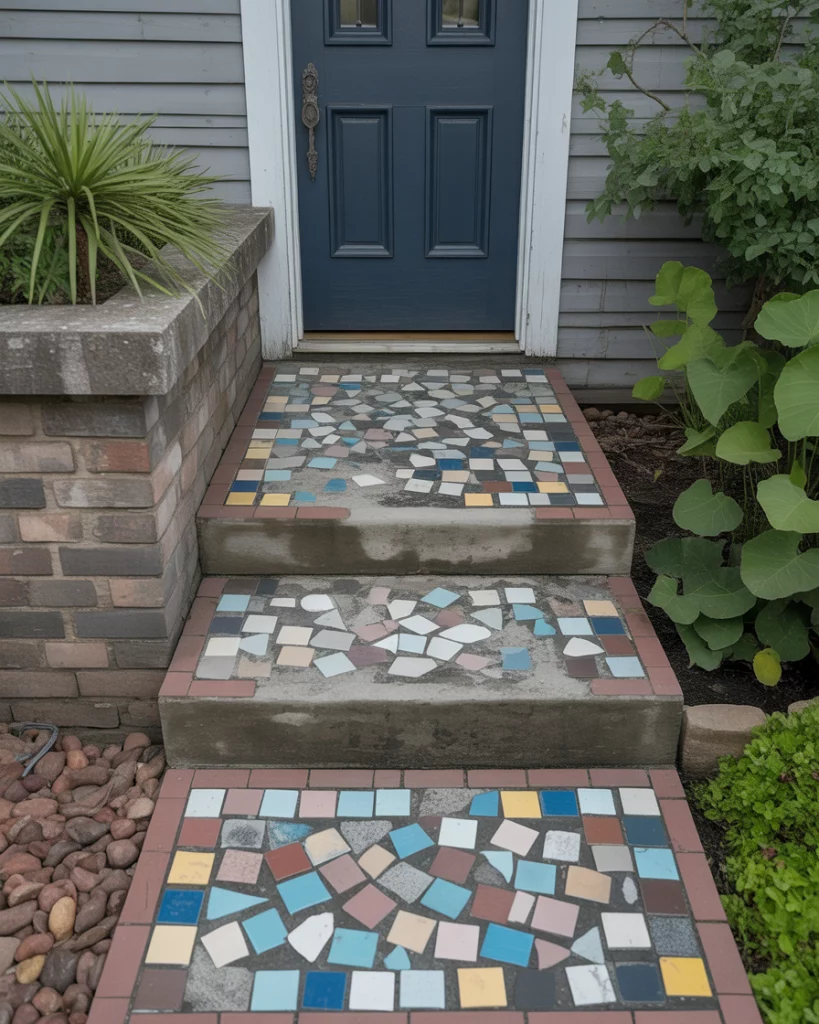 Get creative with a pavers walkway by incorporating mosaic designs from broken brick, stone, or ceramic tiles. Form colorful items into shapes or in patterns like swirls, flowers, or even your house number at the side of you front entrance. This is a rather daring concept that makes your way an outdoor art installation and gives individual flavor to it. Use concrete base pavers to hold the mosaic steady—an artsy, joyful alternative to traditional patterns.