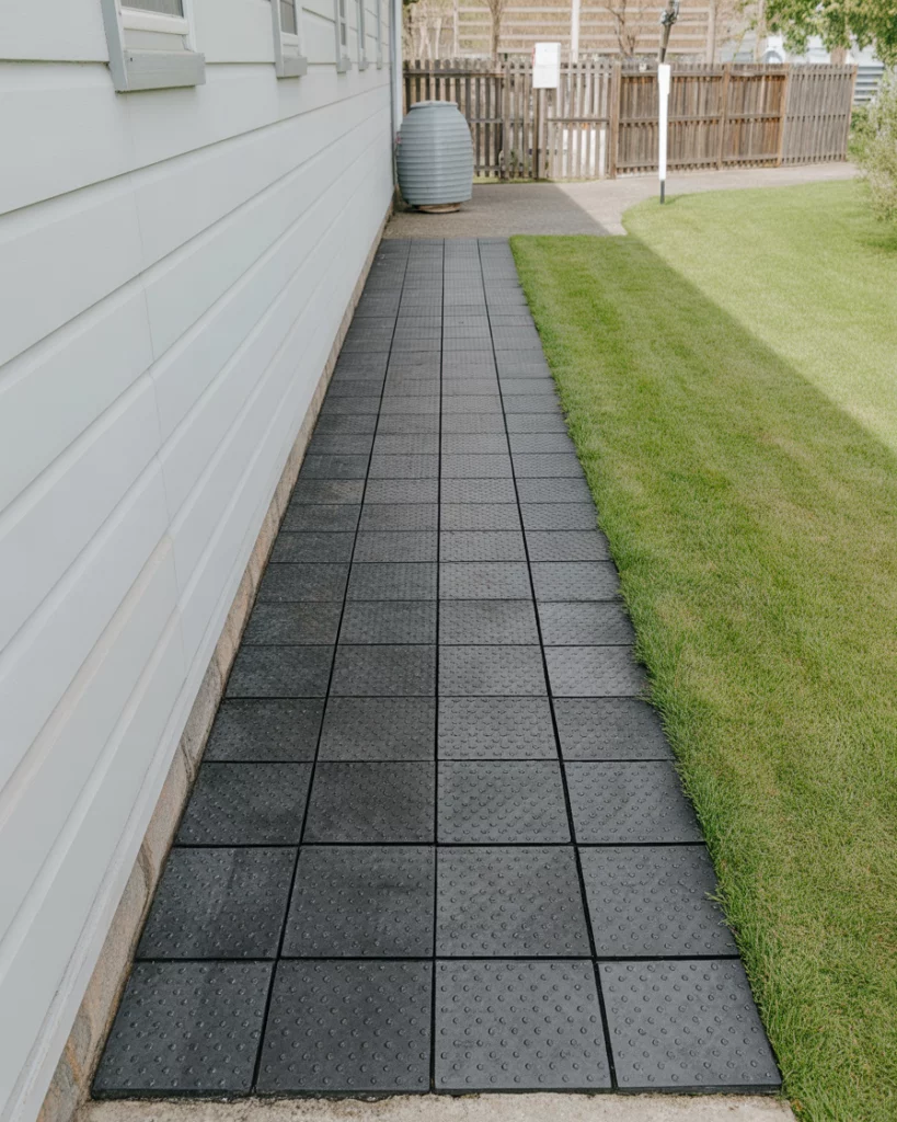 For a clean and safe side of house walkway, rubber tiles with built-in texture offer traction and durability. You should use earth tone or red finishes to complement the color of your house. Such tiles are usually interlocking and can be installed as a DIY job especially in utility paths. They’re a great solution where you need practicality over ornament, such as between your gate and trash can area.