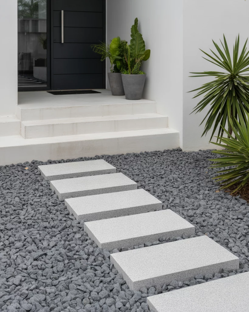 Combine square granite slabs spaced evenly across a gravel base for a minimal and orderly path. The combination of textures gives it the visual interest that was not cluttered, an ideal look of a modern or minimalist backyard style with a front entrance. Fill all the area around the pads with pea gravel so everything is tidy. This design is not only beautiful but also extremely easy to maintain, ideal for busy homeowners.