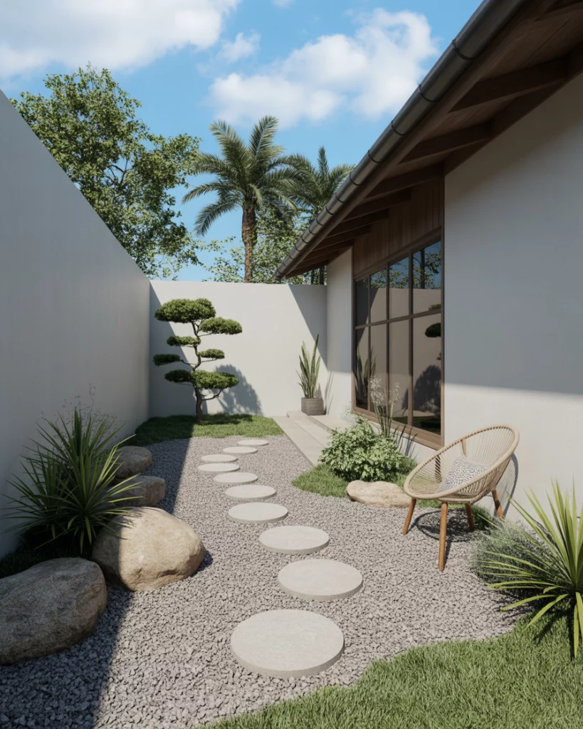 Don’t ignore functional spaces—turn your route to the trash can or utility area into a thoughtful rock walkway. Take fine crushed rock or pea-gravel, and bordered with simple edging or timber. Place some stepping stones or small pavers so that walking is easy. This diy-friendly idea elevates even the most mundane parts of your house, and keeps mud and mess out of sight.