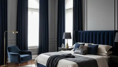 Mix navy blue with red for a romantic, vintage French vibe — perfect for women who adore elegant charm. Apply red velvet headboards, dark navy-coloured walls, and some beige and gold details sparkles such as exquisite mirrors or chandeliers. The space becomes both dramatic and graceful, ideal for a chic apartment or classic home.