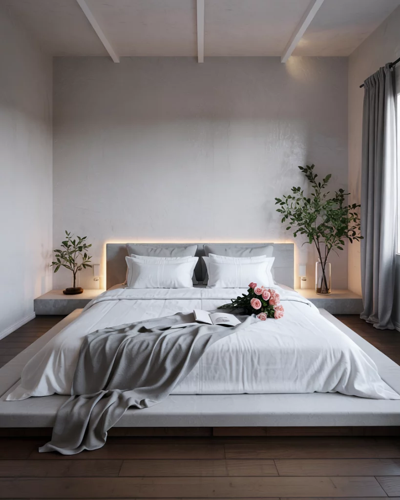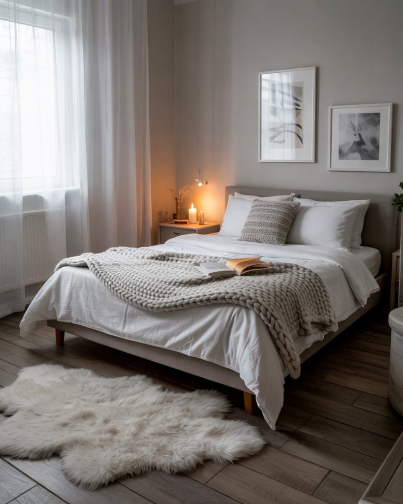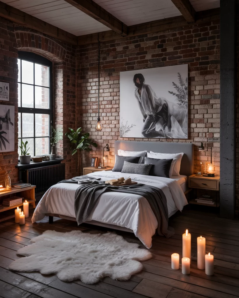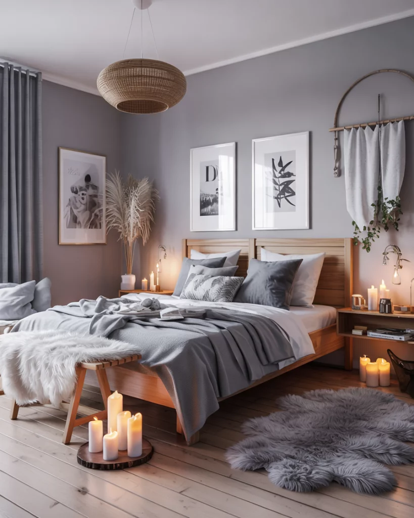 If you’re into clean aesthetics and understated warmth, this calm Nordic-inspired idea is for you. Light wood, grays, and simple environment foster a clear and serene environment in which couples can relax. A faux fur throw and neutral palette set the tone, while soft candles enhance the intimate atmosphere.