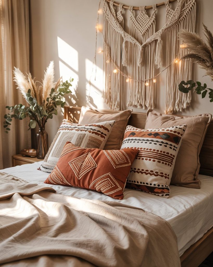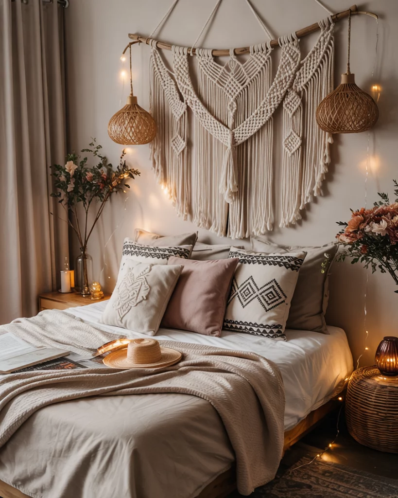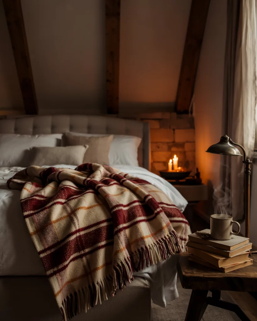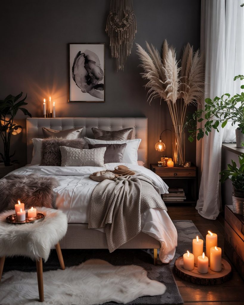 This idea revolves around touch. Play up the feel of the room: Faux fur throws, silk sheets, velvet cushions, and chunky knits are a few of the tools to apply. The perfect date night, it is a sensory playground of couples who love to spoil themselves. Add scented candles, moody lighting, and maybe even a soft rug underfoot to turn every surface into a pleasure zone.