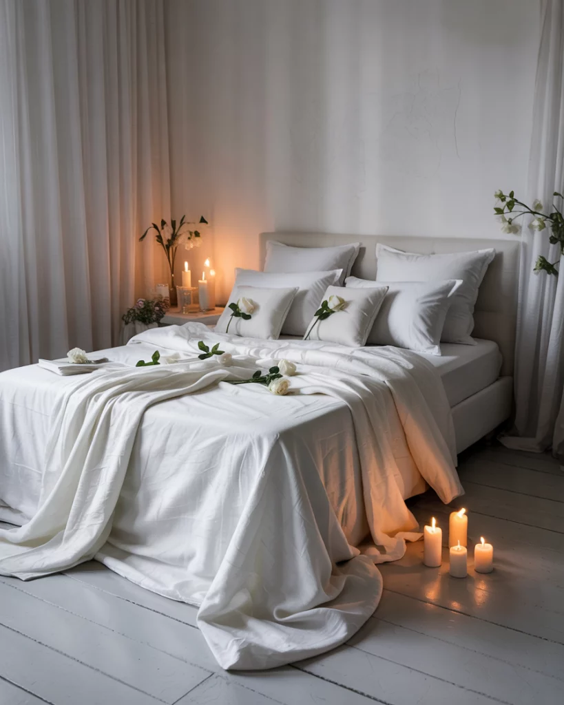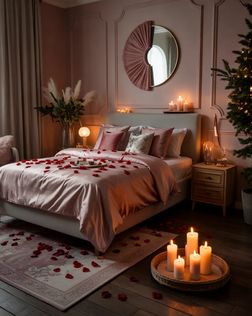 Designed especially for women who love a touch of softness, this idea is all about delicate pinks, creamy whites, and luxe textures. Create a candy and sexy refuge with lace, chiffon and florals. This type of decoration is very discreet yet strongly romantic- just what he needs to see when coming into a surprise date night. Pair with a soft scent and muted lighting to create a dreamy ambiance.