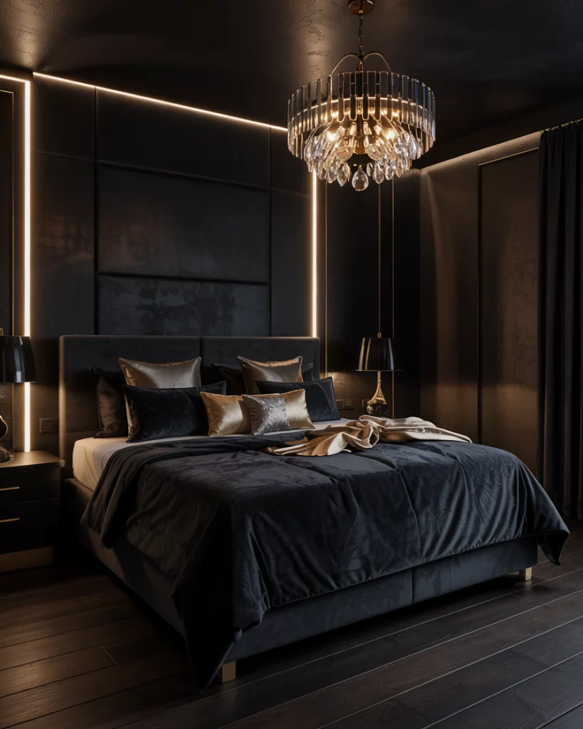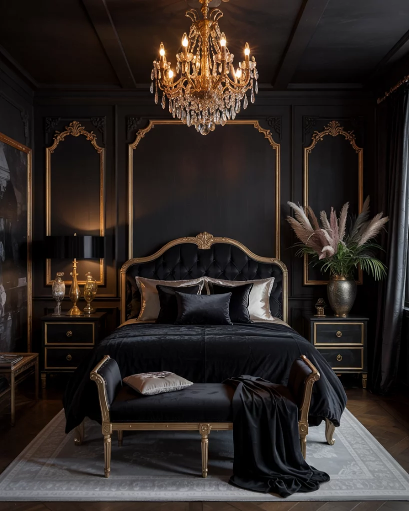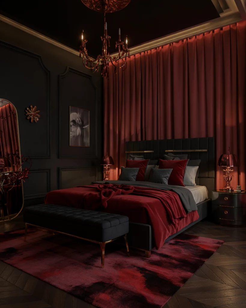 For those who love drama with a touch of luxury, go all in with black as your theme. Walls are black, accents made of leather, details are gold which gives a high-end, sexual mood. Will suit couples who are more on the bold/elegant side of design. Match with a crystal chandelier and crushed velvet to be very chic. Surprise your partner for anniversary or for date night with something totally unexpected.