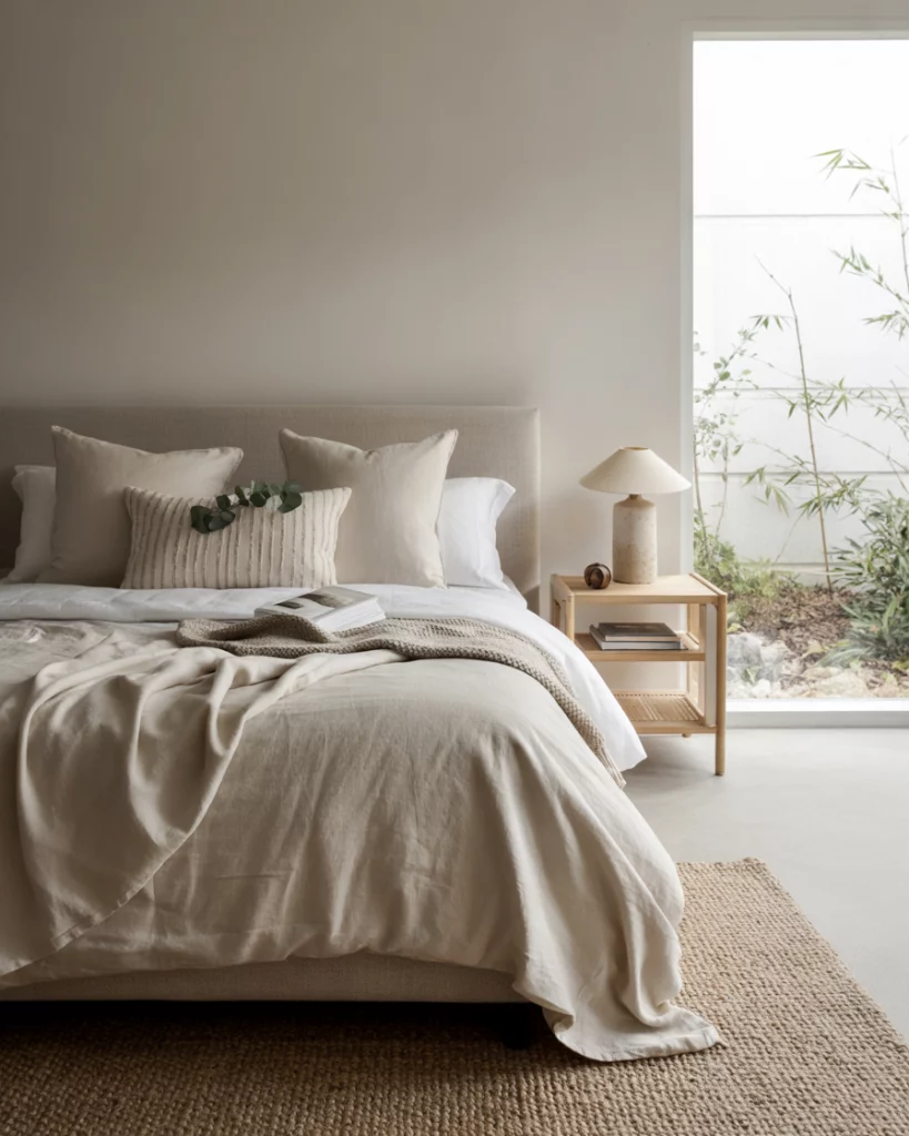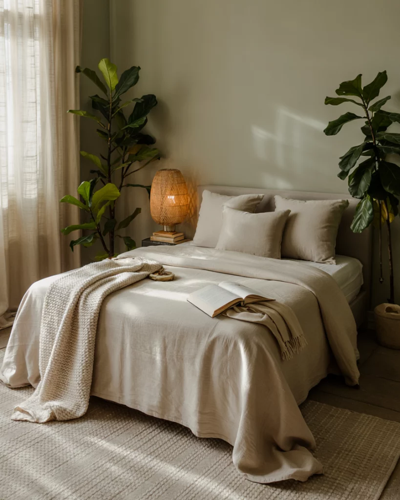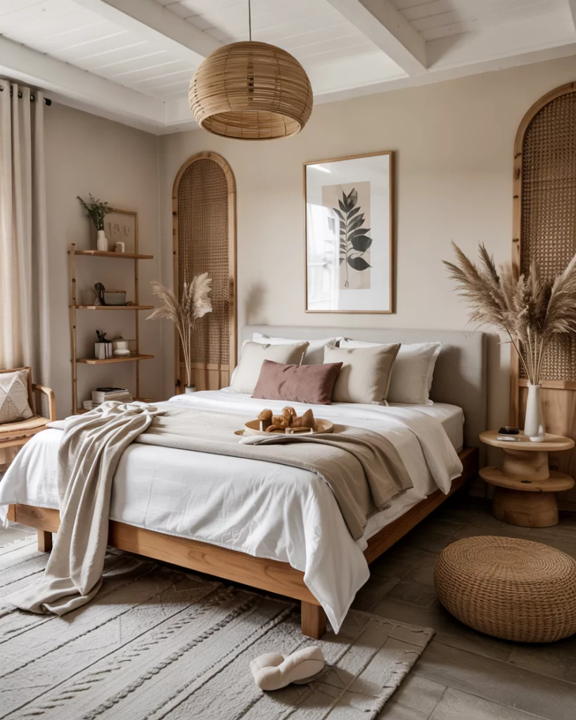 Blending Japanese minimalism and Scandinavian coziness, Japandi is a rising design trend that’s perfect for couples who crave calm and connection. Use natural wood tones, clean lines, and neutral colors. The beddings are soft and so are the woven fabrics that make the room feel homey but never cluttered. This minimalist idea is ideal for anniversary weekends where simplicity is everything.