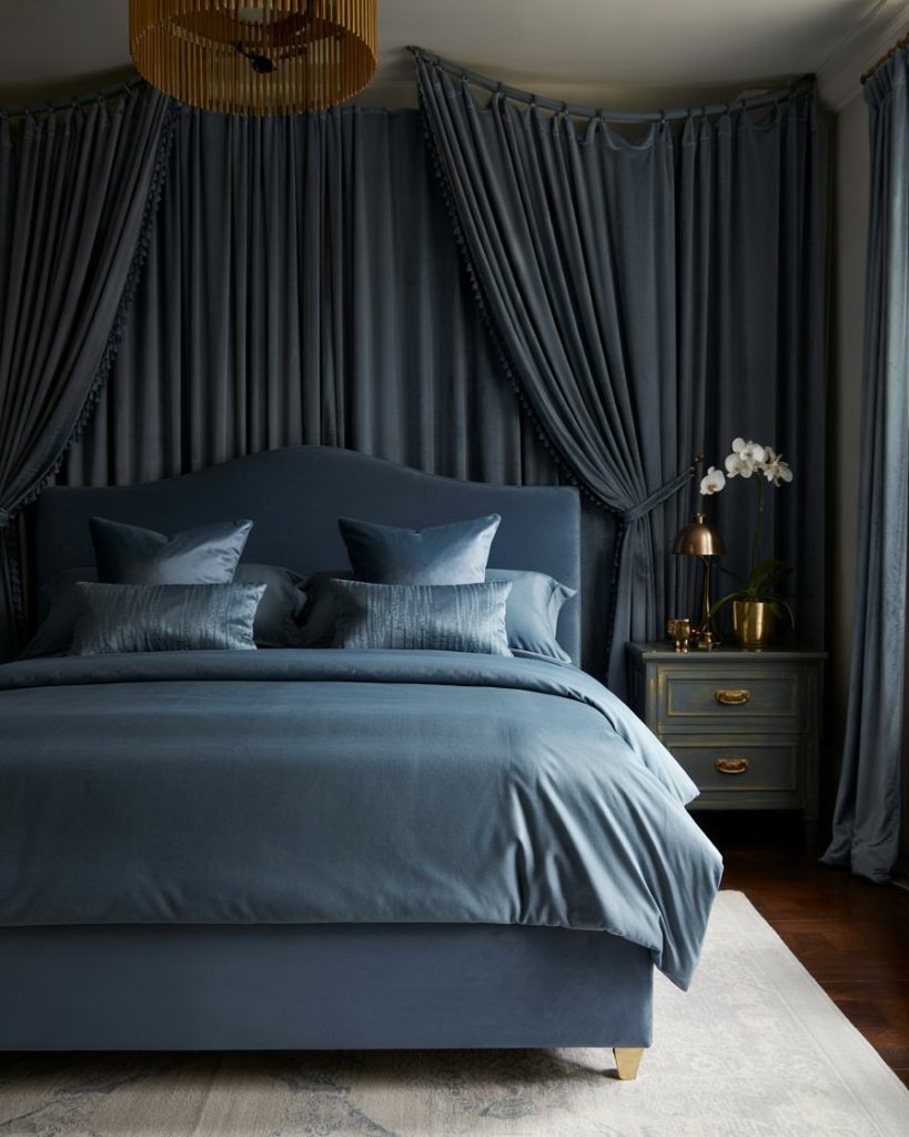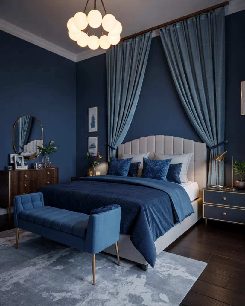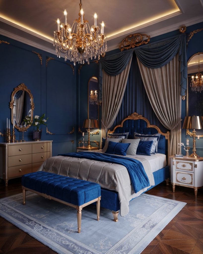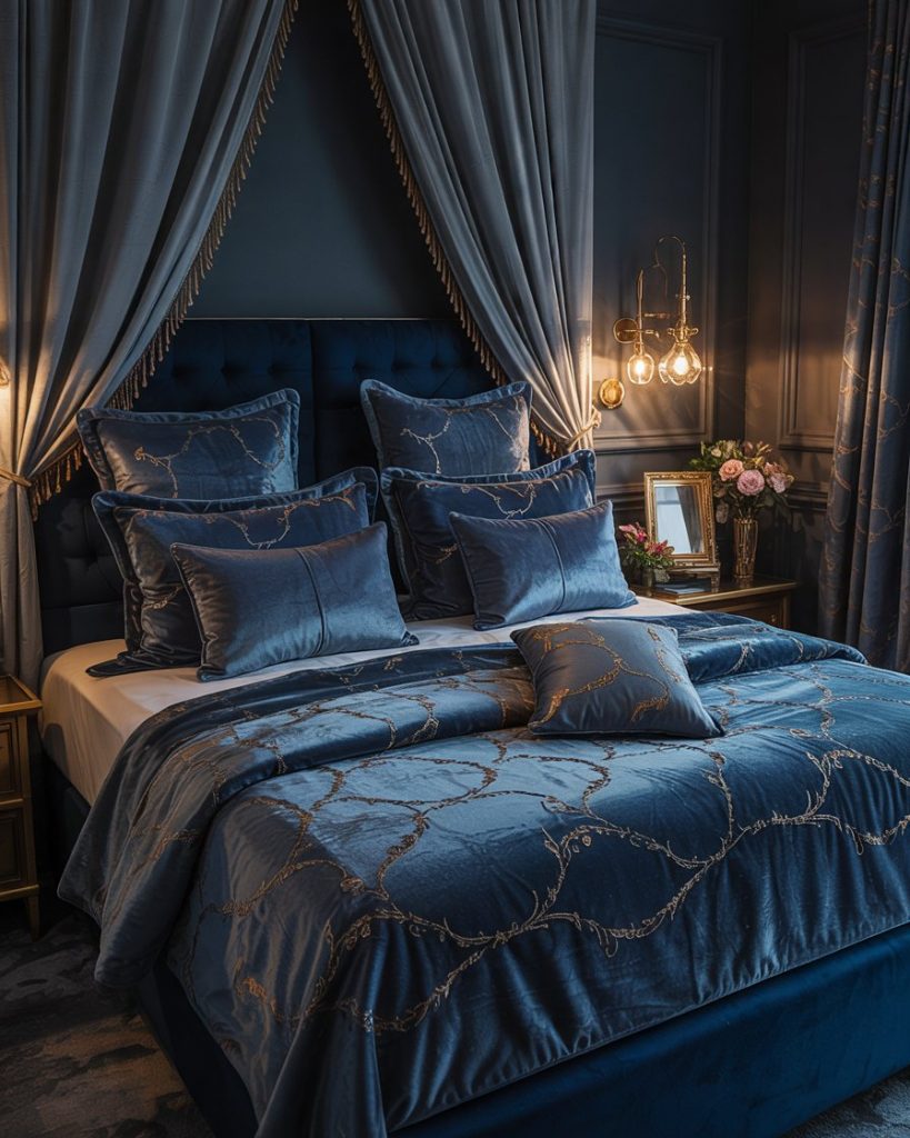 Looking for luxury without going overboard? Gold and royal blue are a sumptuous look. Ideal on date night or to celebrate something special for couples. The walls are velvet pillows of navy, a golden bedframe, and drapes. Add soft uplighting and framed art to round out the elegant setting.
