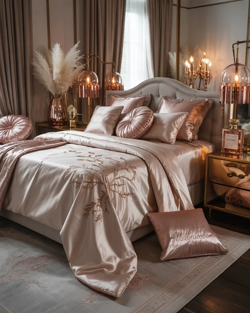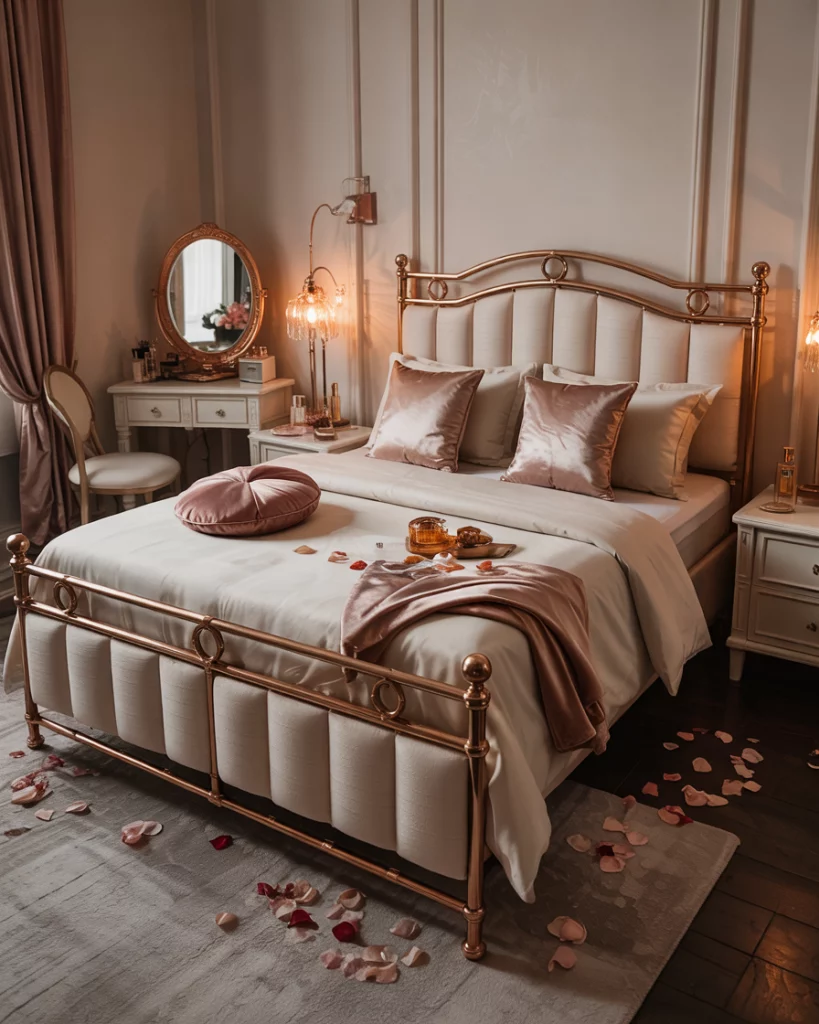 Bring on the shine with rose gold, copper, and metallic details for a bold, glamorous bedroom look. Suits him or couples that are a little blingy. Combine reflective surfaces, metallic-framed mirrors, and glossy furniture. Warm chart lighting and rich materials should not be avoided to give it a cold feel. Great for stylish anniversary celebrations.