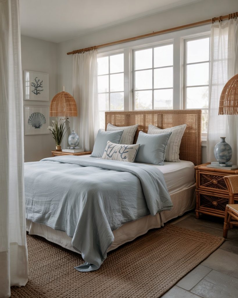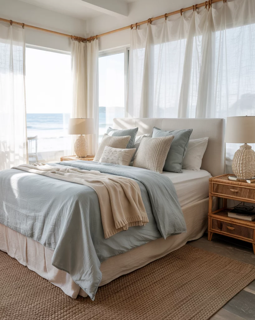 Inspired by breezy beach vacations and couples hotel getaways, this idea brings serenity and a breath of fresh air into your bedroom. Soft blues, sandy neutrals, and natural-fibres are essentials. It is calm, warm, and gives a perfect place to those couples looking forward to having a calmer space. Finish it off with gauzy curtains and sea-glass accoutrements. A peaceful retreat that’s perfect for anniversary unwinding or just a chill date night simple vibe.