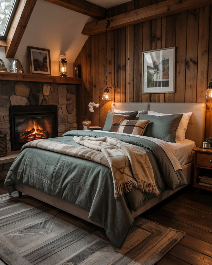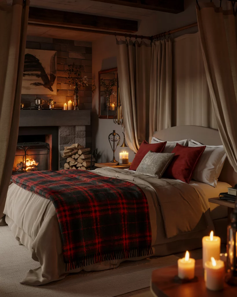 A roaring (or faux) fireplace, plaid bedding, and a cozy wood cabin vibe—this idea is comfort defined. Great as date night easy or winter weekends couples that love nesting. Use wool throws, logs stacked by the hearth, and flickering candles to create a romantic mountain retreat vibe.